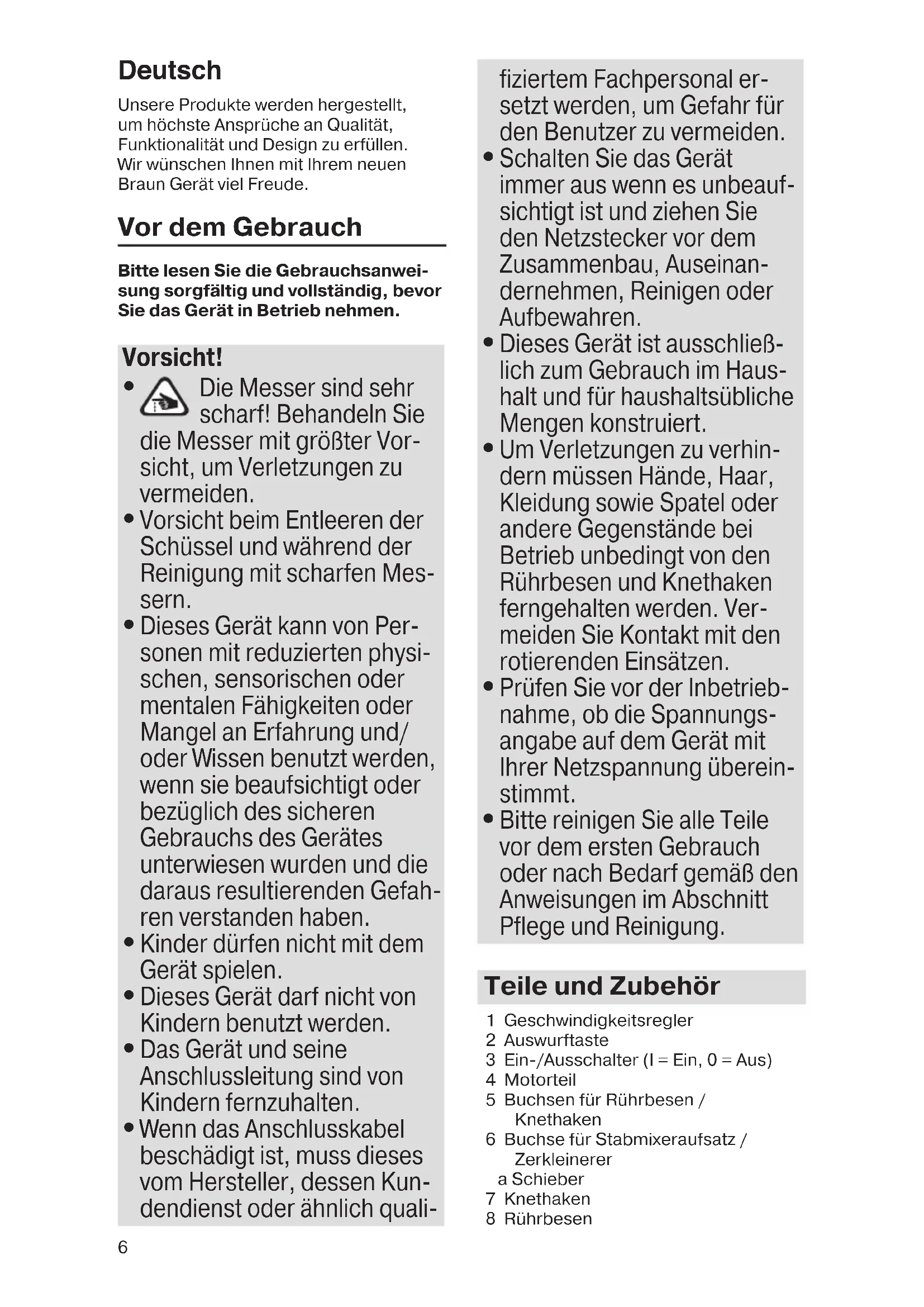- Bei der Verarbeitung von farbstoff- reichen Gütern (z.B. Karotten), können sich die Kunststoffteile des Gerätes verfärben. Diese Teile vor dem Spülen mit Speiseöl abwischen. Die Designspezifikationen und diese Gebrauchsanweisungen können ohne Vorankündigung geändert werden. Entsorgen Sie das Produkt am Ende seiner Nutzungsdauer nicht im Hausmüll. Die mit Nahrungsmitteln in Berührung kommenden Materialien und Gegen-stände stimmen mit den Vorschriften der Europäischen Verordnung 1935/2004 überein. 5722210254_HM 5000_5137 INT_S06_100.indd 9 23.05.17 13:1010 English Our products are engineered to meet the highest standards of quality, functionality and design. We hope you thoroughly enjoy your new Braun appliance. Before use Please read instructions carefully and completely before using the appliance. Caution