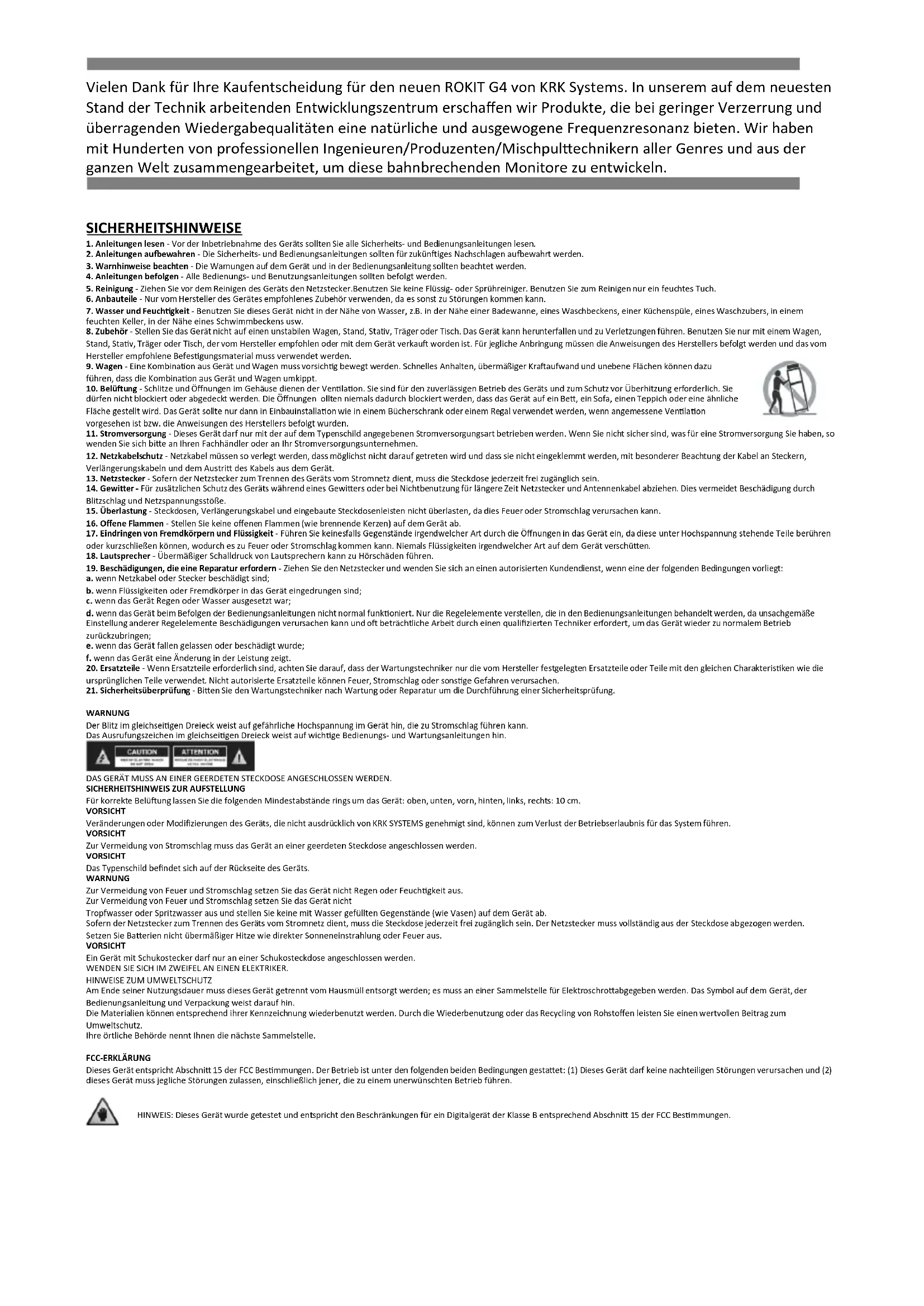 Für korrekte Belüftung lassen Sie die folgenden Mindestabstände rings um das Gerät: oben, unten, vorn, hinten, links, rechts: 10 cm. VORSICHT Veränderungen oder Modifizierungen des Geräts, die nicht ausdrücklich von KRK SYSTEMS genehmigt sind, können zum Verlust der Betriebserlaubnis für das System führen. VORSICHT Zur Vermeidung von Stromschlag muss das Gerät an einer geerdeten Steckdose angeschlossen werden. VORSICHT Das Typenschild befindet sich auf der Rückseite des Geräts. WARNUNG Zur Vermeidung von Feuer und Stromschlag setzen Sie das Gerät nicht Regen oder Feuchtigkeit aus. Zur Vermeidung von Feuer und Stromschlag setzen Sie das Gerät nicht Tropfwasser oder Spritzwasser aus und stellen Sie keine mit Wasser gefüllten Gegenstände (wie Vasen) auf dem Gerät ab. Sofern der Netzstecker zum Trennen des Geräts vom Stromnetz dient, muss die Steckdose jederzeit frei zugänglich sein. Der Netzstecker muss vollständig aus der Steckdose abgezogen werden. Setzen Sie Batterien nicht übermäßiger Hitze wie direkter Sonneneinstrahlung oder Feuer aus. VORSICHT Ein Gerät mit Schukostecker darf nur an einer Schukosteckdose angeschlossen werden. WENDEN SIE SICH IM ZWEIFEL AN EINEN ELEKTRIKER.