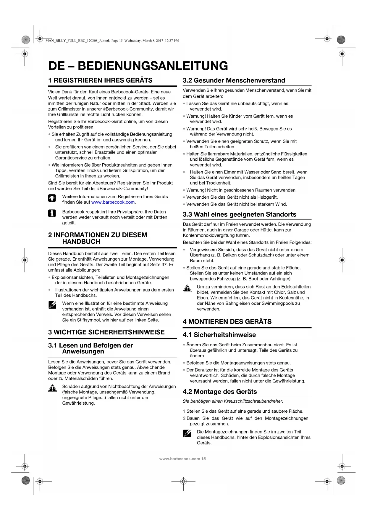 Die Montagezeichnungen finden Sie im zweiten Teil dieses Handbuchs, hinter den Explosionsansichten Ihres Geräts. MAN_BILLY_FULL_BBC_170308_A.book Page 15 Wednesday, March 8, 2017 12:37 PM16 www.barbecook.com