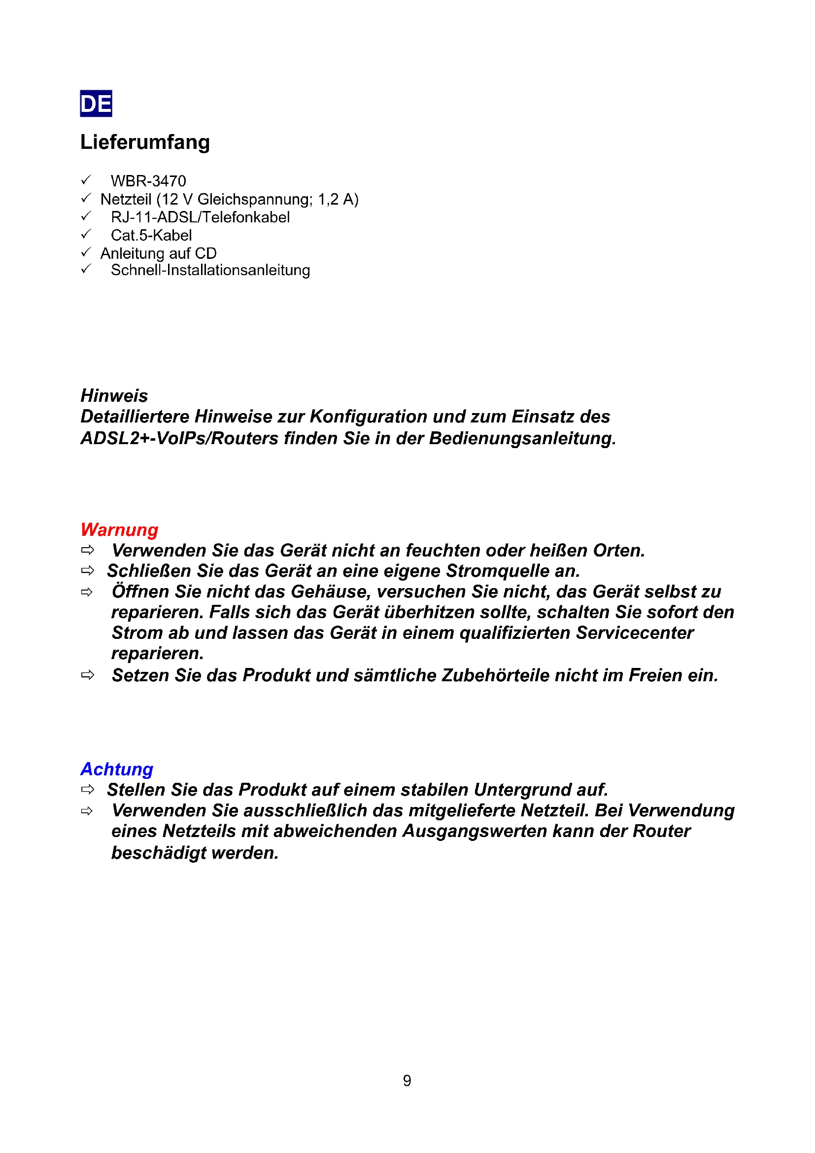 8DE Lieferumfang 3 WBR-3470 3 Netzteil (12 V Gleichspannung; 1,2 A) 3 RJ-11-ADSL/Telefonkabel 3 Cat.5-Kabel 3 Anleitung auf CD 3 Schnell-Installationsanleitung