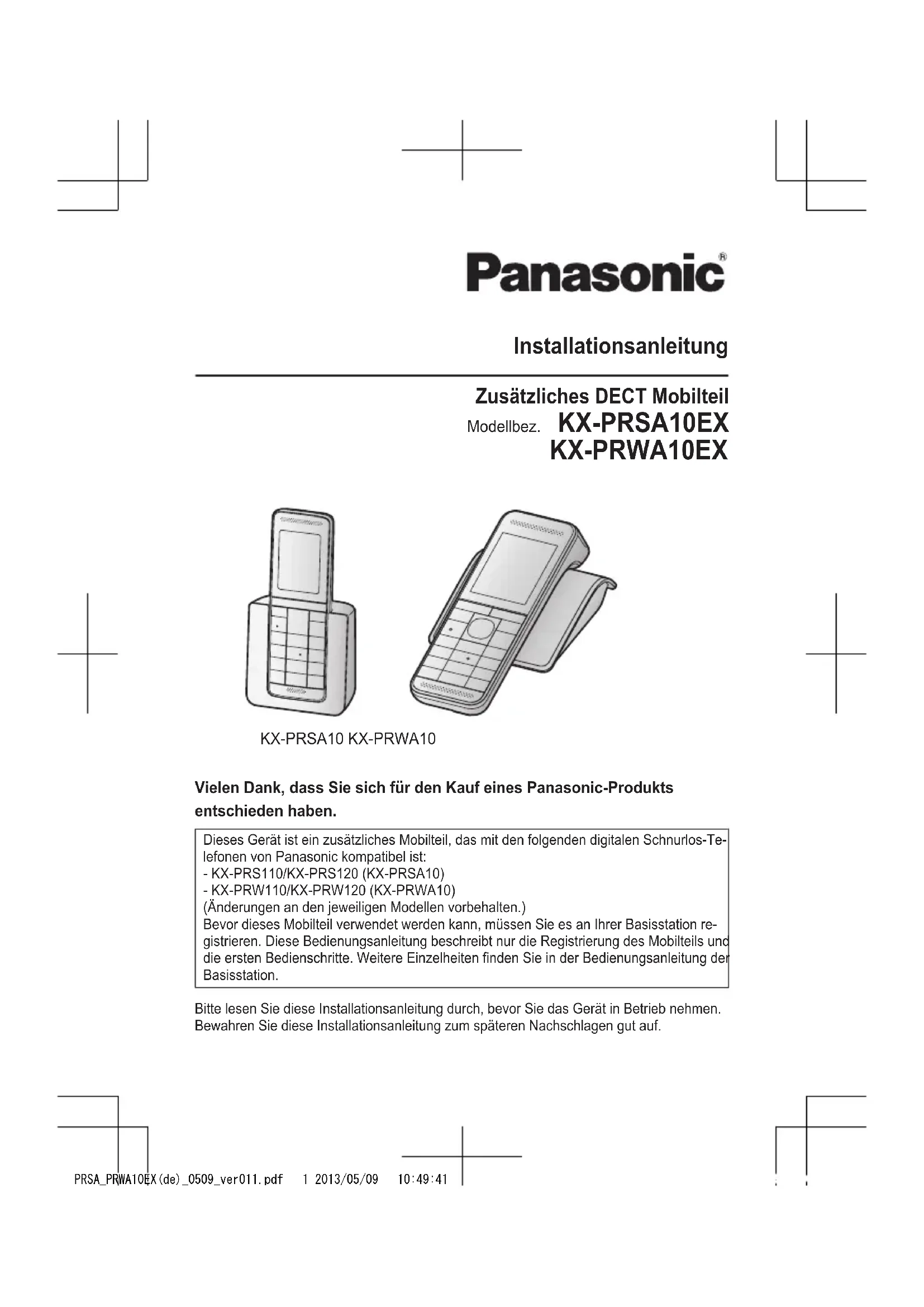 Installation PRWA10EX_PRSA10EX(en-en)_0508_ve8 8 2013/05/08 16:03:38Installationsanleitung Zusätzliches DECT Mobilteil Modellbez. KX-PRSA10EX KX-PRWA10EX KX-PRSA10 KX-PRWA10 Vielen Dank, dass Sie sich für den Kauf eines Panasonic-Produkts entschieden haben. Dieses Gerät ist ein zusätzliches Mobilteil, das mit den folgenden digitalen Schnurlos-Te- lefonen von Panasonic kompatibel ist: - KX-PRS110/KX-PRS120 (KX-PRSA10) - KX-PRW110/KX-PRW120 (KX-PRWA10) (Änderungen an den jeweiligen Modellen vorbehalten.) Bevor dieses Mobilteil verwendet werden kann, müssen Sie es an Ihrer Basisstation re- gistrieren. Diese Bedienungsanleitung beschreibt nur die Registrierung des Mobilteils und die ersten Bedienschritte. Weitere Einzelheiten finden Sie in der Bedienungsanleitung der Basisstation. Bitte lesen Sie diese Installationsanleitung durch, bevor Sie das Gerät in Betrieb nehmen. Bewahren Sie diese Installationsanleitung zum späteren Nachschlagen gut auf. PRSA_PRWA10EX(de)_0509_ver011.pdf 1 2013/05/09 10:49:41Zubehör-Informationen Mitgeliefertes Zubehör Zubehör/Teilenummer Menge Ladeschale 1 Netzteil/PNLV233CE 1 Standardakkus