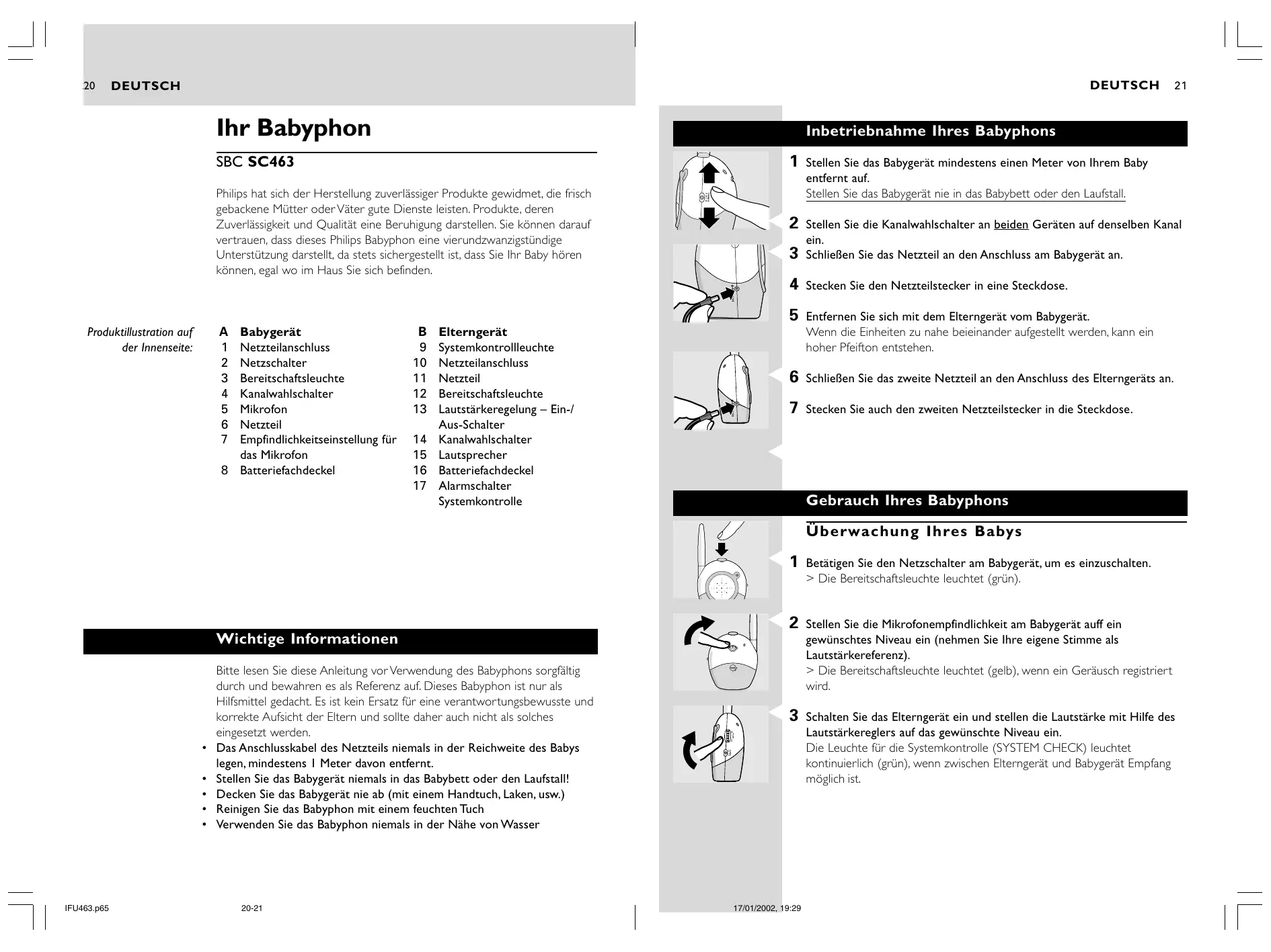- Kontinuierliche Kommunikationsverbindung (nicht hörbares Signal hilft Störungen zu verringern und sichert eine kontinuierliche Verbindung zwischen beiden Geräten, so dass Sie nur die Geräusche Ihres Babys hören). Kein Geräusch. Lautstärke am Elterngerät zu niedrig Lautstärkeregler nach unten drehen. eingestellt. Netzteil ist nicht angeschlossen oder Netzteil anschließen oder Batterien Batterien sind erschöpft. ersetzen. Bab ygerät: Gerät ist nicht Babygerät: eingeschaltet. Netzschalter betätigen. Elterngerät vom Babygerät entfernen. Den Lautstärkeregler am Elterngerät nach oben drehen. Bereitschaftsleuchte blinkt. Batterien sind schwach oder leer. Batterien ersetzen oder an Strom anschließen. Störungen oder schlechter Empfang. Handy oder schnurloses Telefon zu nahe am Babyphon. Telefone aus der Nähe der Geräte entfernen. Empfang eines anderen Babyphons. Beide Systeme arbeiten auf derselben Frequenz. Kanäle umschalten. Systemkontrollleuchte blinkt (rot) / Systemkontrollalarm. Geräte sind außerhalb der Reichweite oder es gibt Störungen von einer anderen UKWStrahlenquelle. Geräte näher zusammen bringen um Verbindung wieder herzustellen. Andere UKW-Strahlenquellen beseitigen. IFU463.p65 24-25 Sendefrequenzen: 17/01/2002, 19:29 SBC SC463/00: SBC SC463/05 (IRE, UK): SBC SC463/16 (ES): von 40,695 bis 40,675 MHz von 49,830 bis 40,890 MHz von 31,000 bis 31,350 MHz