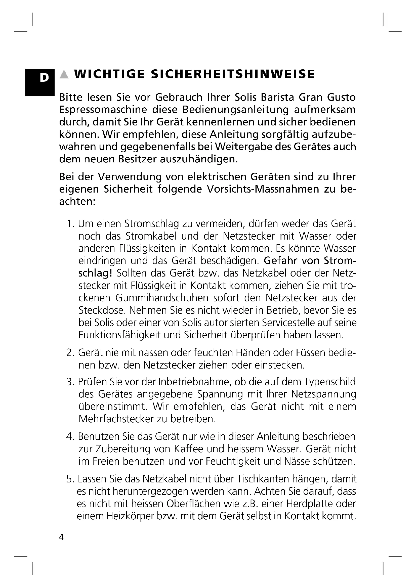 WICHTIGE SICHERHEITSHINWEISE Bitte lesen Sie vor Gebrauch Ihrer Solis Barista Gran Gusto Espressomaschine diese Bedienungsanleitung aufmerksam durch, damit Sie Ihr Gerät kennenlernen und sicher bedienen können. Wir empfehlen, diese Anleitung sorgfältig aufzube- wahren und gegebenenfalls bei Weitergabe des Gerätes auch dem neuen Besitzer auszuhändigen. Bei der Verwendung von elektrischen Geräten sind zu Ihrer eigenen Sicherheit folgende Vorsichts-Massnahmen zu be- achten: