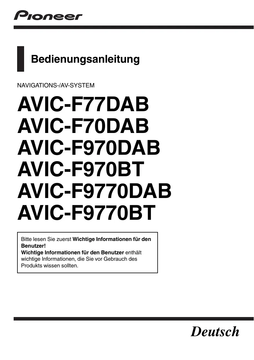 NAVIGATIONS-/AV-SYSTEM AVIC-F77DAB AVIC-F70DAB AVIC-F970DAB AVIC-F970BT AVIC-F9770DAB AVIC-F9770BT Bitte lesen Sie zuerst Wichtige Informationen für den Benutzer! Wichtige Informationen für den Benutzer enthält wichtige Informationen, die Sie vor Gebrauch des Produkts wissen sollten.