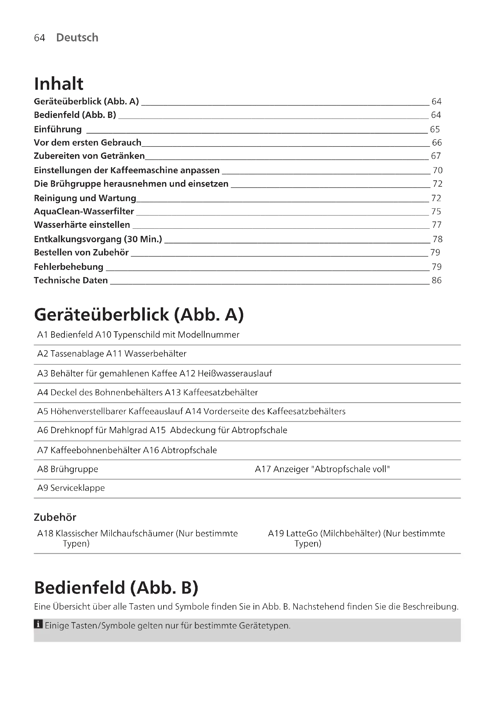 Deutsch Deutsch Inhalt Geräteüberblick (Abb. A) _________________________________________________________________ 64Bedienfeld (Abb. B) ______________________________________________________________________ 64Einführung _____________________________________________________________________________ 65Vor dem ersten Gebrauch_________________________________________________________________ 66Zubereiten von Getränken________________________________________________________________ 67Einstellungen der Kaffeemaschine anpassen _______________________________________________ 70Die Brühgruppe herausnehmen und einsetzen _____________________________________________ 72Reinigung und Wartung__________________________________________________________________ 72AquaClean-Wasserfilter __________________________________________________________________ 75Wasserhärte einstellen ___________________________________________________________________ 77Entkalkungsvorgang (30 Min.) ____________________________________________________________ 78Bestellen von Zubehör ___________________________________________________________________ 79Fehlerbehebung _________________________________________________________________________ 79Technische Daten ________________________________________________________________________ 86 Geräteüberblick (Abb. A) A1 Bedienfeld A10 Typenschild mit ModellnummerA2 Tassenablage A11 WasserbehälterA3 Behälter für gemahlenen Kaffee A12 HeißwasserauslaufA4 Deckel des Bohnenbehälters A13 KaffeesatzbehälterA5 Höhenverstellbarer Kaffeeauslauf A14 Vorderseite des KaffeesatzbehältersA6 Drehknopf für Mahlgrad A15 Abdeckung für AbtropfschaleA7 Kaffeebohnenbehälter A16 AbtropfschaleA8 Brühgruppe A17 Anzeiger "Abtropfschale voll"A9 Serviceklappe Zubehör A18 Klassischer Milchaufschäumer (Nur bestimmteTypen)A19 LatteGo (Milchbehälter) (Nur bestimmteTypen) Bedienfeld (Abb. B) Eine Übersicht über alle Tasten und Symbole finden Sie in Abb. B. Nachstehend finden Sie die Beschreibung. Einige Tasten/Symbole gelten nur für bestimmte Gerätetypen.65 Deutsch Deutsch B1 Ein-/Ausschalter B7 Warnsymbole B2 Getränke-Symbole* B8 Start-Anzeige B3 Aromastärke-/Gemahlener Kaffee-Symbol B9 Start/Stopp-Taste -Taste B4 Trinkmenge-Symbol B10 Calc/Clean (Entkalken)-Symbol B5 Milchmenge-Symbol (nur bestimmte Gerätetypen) B11 AquaClean-Symbol B6 Kaffeetemperatur-Symbol (nur bestimmte Gerätetypen)