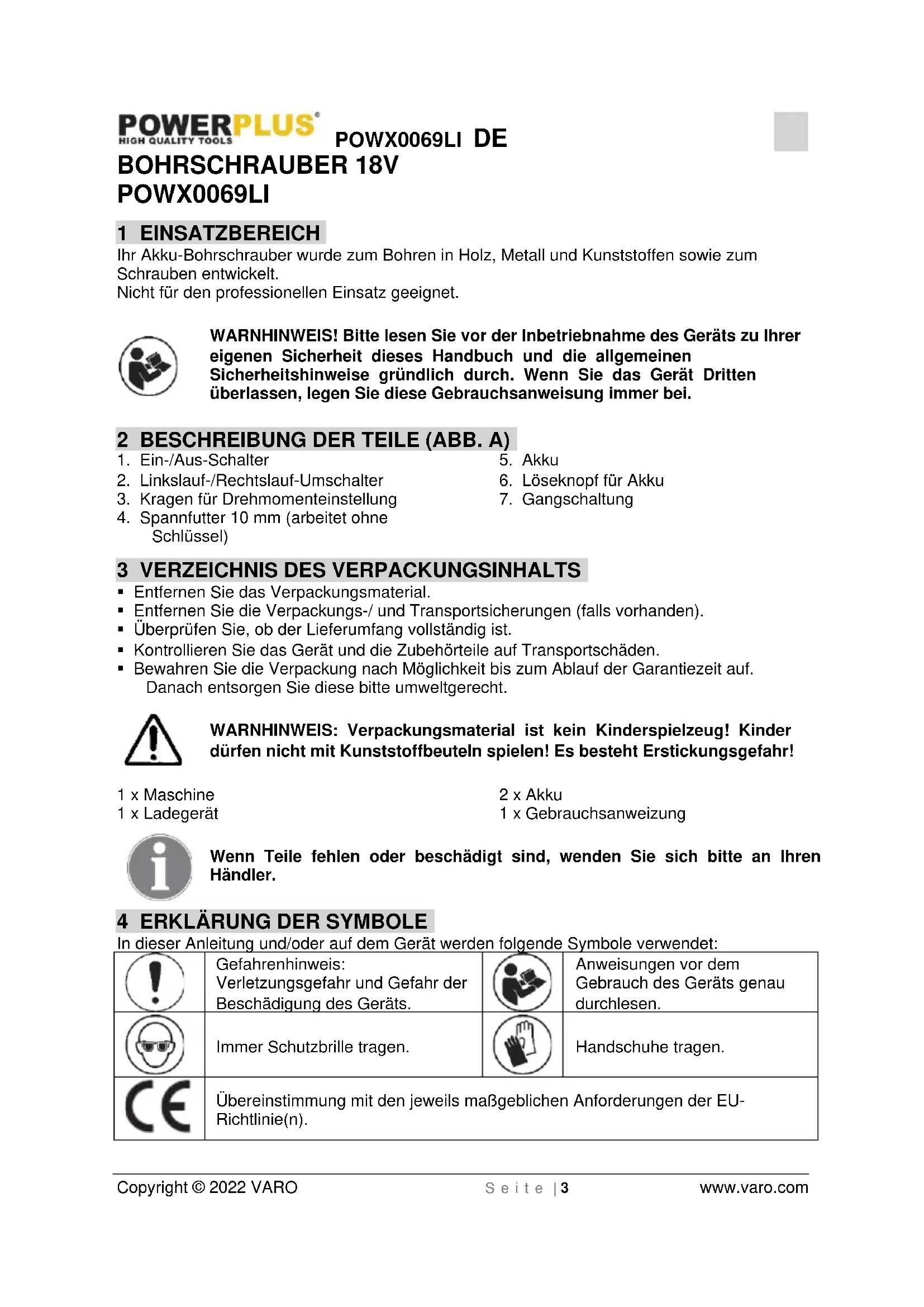 - Tragen Sie eine persönliche Schutzausrüstung und immer eine Schutzbrille. Das Tragen von persönlicher Schutzausrüstung, wie Staubmaske, rutschfeste Sicherheitsschuhe,POWX0069LI DE Copyright © 2022 VARO S e i t e | 5 www.varo.com Schutzhelm oder Ohrenschutz, je nach Art und Einsatz des Geräts, verringert das Verletzungsrisiko.
