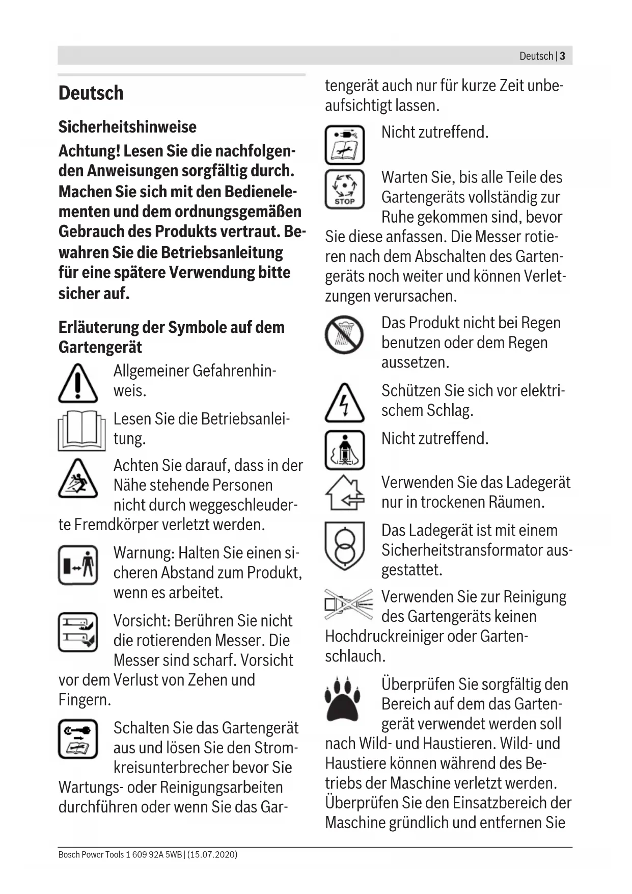 r eine spätere Verwendung bitte sicher auf. Erläuterung der Symbole auf dem Gartengerät Allgemeiner Gefahrenhin- weis. Lesen Sie die Betriebsanlei- tung. Achten Sie darauf, dass in der Nähe stehende Personen nicht durch weggeschleuder- te Fremdkörper verletzt werden. Warnung: Halten Sie einen si- cheren Abstand zum Produkt, wenn es arbeitet. Vorsicht: Berühren Sie nicht die rotierenden Messer. Die Messer sind scharf. Vorsicht vor dem Verlust von Zehen und Fingern. Schalten Sie das Gartengerät aus und lösen Sie den Strom- kreisunterbrecher bevor Sie Wartungs- oder Reinigungsarbeiten durchführen oder wenn Sie das Gar- tengerät auch nur für kurze Zeit unbe- aufsichtigt lassen. Nicht zutreffend. Warten Sie, bis alle Teile des Gartengeräts vollständig zur Ruhe gekommen sind, bevor Sie diese anfassen. Die Messer rotie- ren nach dem Abschalten des Garten- geräts noch weiter und können Verlet- zungen verursachen. Das Produkt nicht bei Regen benutzen oder dem Regen aussetzen. Schützen Sie sich vor elektri- schem Schlag. Nicht zutreffend. Verwenden Sie das Ladegerät nur in trockenen Räumen. Das Ladegerät ist mit einem Sicherheitstransformator aus- gestattet. Verwenden Sie zur Reinigung des Gartengeräts keinen Hochdruckreiniger oder Garten- schlauch. Überprüfen Sie sorgfältig den Bereich auf dem das Garten- gerät verwendet werden soll nach Wild- und Haustieren. Wild- und Haustiere können während des Be- triebs der Maschine verletzt werden. Überprüfen Sie den Einsatzbereich der Maschine gründlich und entfernen Sie Bosch Power Tools 1 609 92A 5WB | (15.07.2020)4 | Deutsch alle Steine, Stöcke, Drähte, Knochen und fremde Gegenstände. Achten Sie beim Einsatz der Maschine darauf, dass keine Wildtiere, Haustiere oder kleine Baumstümpfe im dichten Gras versteckt sind. Bedienung u Niemals Kindern oder mit diesen An- weisungen nicht vertrauten Perso- nen erlauben das Produkt zu benut- zen. Nationale Vorschriften be- schränken möglicherweise das Alter des Bedieners. Bewahren Sie das Produkt für Kinder unerreichbar auf, wenn es nicht in Gebrauch ist. u Erlauben Sie Kindern, Personen mit eingeschränkten physischen, senso- rischen oder geistigen Fähigkeiten oder mangelnder Erfahrung und/ oder mangelndem Wissen und/oder mit diesen Anweisungen nicht ver- trauten Personen niemals, das Pro- dukt zu benutzen. Nationale Vor- schriften beschränken möglicher- weise das Alter des Bedieners. u Kinder sollten beaufsichtigt werden, um sicherzustellen, dass sie nicht mit dem Produkt spielen. u Benutzen Sie das Gartengerät nie- mals während sich Personen, insbe- sondere Kinder oder Haustiere, in unmittelbarer Nähe aufhalten. u Der Bediener ist fur Unfälle oder Schäden an anderen Menschen oder deren Eigentum verantwortlich. u Benutzen Sie keine offenen Gummi- schuhe oder Sandalen, wenn Sie das Produkt benutzen. Tragen Sie stets festes Schuhwerk und eine lange Ho- se. Benutzen Sie das Produkt nie barfuß. u Inspizieren Sie die zu bearbeitende Fläche sorgfältig und beseitigen Sie Steine, Stöcke, Drähte, Knochen und sonstige Fremdkörper. u Prüfen Sie vor der Benutzung immer, ob Messer, Messerschrauben und Schneidbaugruppe abgenutzt oder beschädigt sind. Tauschen Sie abge- nutzte oder beschädigte Messer so- wie Messerschrauben immer im gan- zen Satz aus, um Unwucht zu vermei- den. u Mähen Sie nur bei Tageslicht oder gutem künstlichem Licht. u Bei schlechten Wetterbedingungen insbesondere bei einem aufziehen- dem Gewitter nicht mit dem Rasen- mäher arbeiten. u Betreiben Sie das Gartengerät nach Möglichkeit nicht bei nassem Gras. u Stets ruhig gehen, niemals schnell laufen. u Betreiben Sie das Gartengerät nie- mals mit defekten Schutzvorrichtun- gen, Abdeckungen oder ohne Sicher- heitseinrichtungen, wie z.B. Prall- schutz und/oder Grasfangkorb. u Wir empfehlen, einen Gehörschutz zu Ihrem eigenen Schutz zu tragen. u Benutzen Sie das Produkt nicht, wenn Sie müde oder krank sind oder unter dem Einfluss von Alkohol, Dro- gen oder Medikamenten stehen. 1 609 92A 5WB | (15.07.2020) Bosch Power ToolsDeutsch | 5 u Das Arbeiten an Böschungen kann gefährlich sein: − Mähen Sie keine besonders steilen Abhänge. − Achten Sie auf schrägen Flächen oder auf nassem Gras stets auf si- cheren Tritt. − Mähen Sie auf schrägen Flächen immer quer und niemals auf- und ab- wärts. − Gehen Sie beim Richtungswechsel an Abhängen äußerst vorsichtig vor. u Gehen Sie beim Rückwärtsgehen oder Ziehen des Gartengeräts äu- ßerst vorsichtig vor. u Schieben Sie das Gartengerät beim Mähen immer vorwärts und ziehen Sie dieses niemals zum Körper hin. u Die Messer müssen stehen, wenn Sie das Gartengerät für den Transport kippen müssen, wenn Sie nicht mit Gras bepflanzte Flächen überqueren und wenn Sie das Gartengerät zu und von dem zu mähenden Bereich transportieren. u Kippen Sie das Gartengerät beim Starten oder Anlassen des Motors nicht. u Schalten Sie das Gartengerät wie in der Betriebsanleitung beschrieben ein und achten Sie darauf, dass Ihre Füße ausreichend weit von rotieren- den Teilen entfernt sind. u Bringen Sie Ihre Hände und Füße nicht in die Nähe oder unter rotieren- de Teile. u Halten Sie Abstand zur Auswurfzone, wenn Sie mit dem Gartengerät arbei- ten. u Heben bzw. tragen Sie das Gartenge- rät niemals bei laufendem Motor. u Achten Sie darauf, dass bei der Lagerung das Gartengerät mit allen 4 Räder auf dem Boden steht. u Heben Sie das Gartengerät nur mit dem Tragegriff an. Den Tragegriff mit Vorsicht behandeln. u Nehmen Sie keine Veränderungen am Gerät vor. Unzulässige Verände- rungen können die Sicherheit Ihres Gerätes beeinträchtigen, zu ver- stärkten Geräuschen und Vibratio- nen und schlechter Leistung führen. Laubsammeln Das Laubsammelmesser ist so ge- formt, dass es Herbstlaub von ihrem Rasen aufnehmen kann. Damit diese Funktion ein optimales Ergebnis er- zielt, ist folgendes einzuhalten: – Sammeln Sie Laub nur bei maxima- ler Schnitth