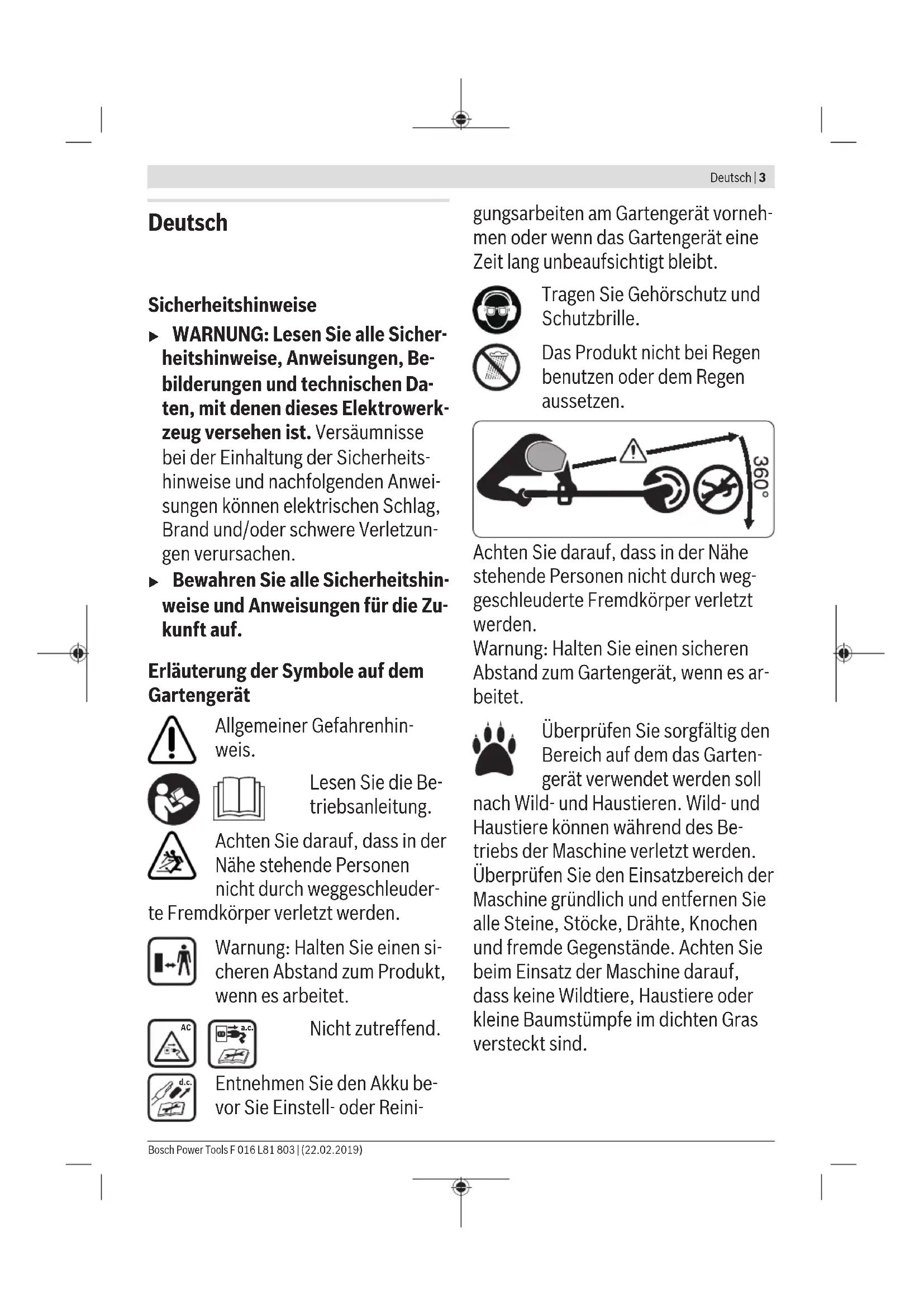 F 016 L81 803 | (22.02.2019) Bosch Power ToolsDeutsch | 3 Deutsch Sicherheitshinweise u WARNUNG: Lesen Sie alle Sicher- heitshinweise, Anweisungen, Be- bilderungen und technischen Da- ten, mit denen dieses Elektrowerk- zeug versehen ist. Versäumnisse bei der Einhaltung der Sicherheits- hinweise und nachfolgenden Anwei- sungen können elektrischen Schlag, Brand und/oder schwere Verletzun- gen verursachen. u Bewahren Sie alle Sicherheitshin- weise und Anweisungen für die Zu- kunft auf. Erläuterung der Symbole auf dem Gartengerät Allgemeiner Gefahrenhin- weis. Lesen Sie die Be- triebsanleitung. Achten Sie darauf, dass in der Nähe stehende Personen nicht durch weggeschleuder- te Fremdkörper verletzt werden. Warnung: Halten Sie einen si- cheren Abstand zum Produkt, wenn es arbeitet.