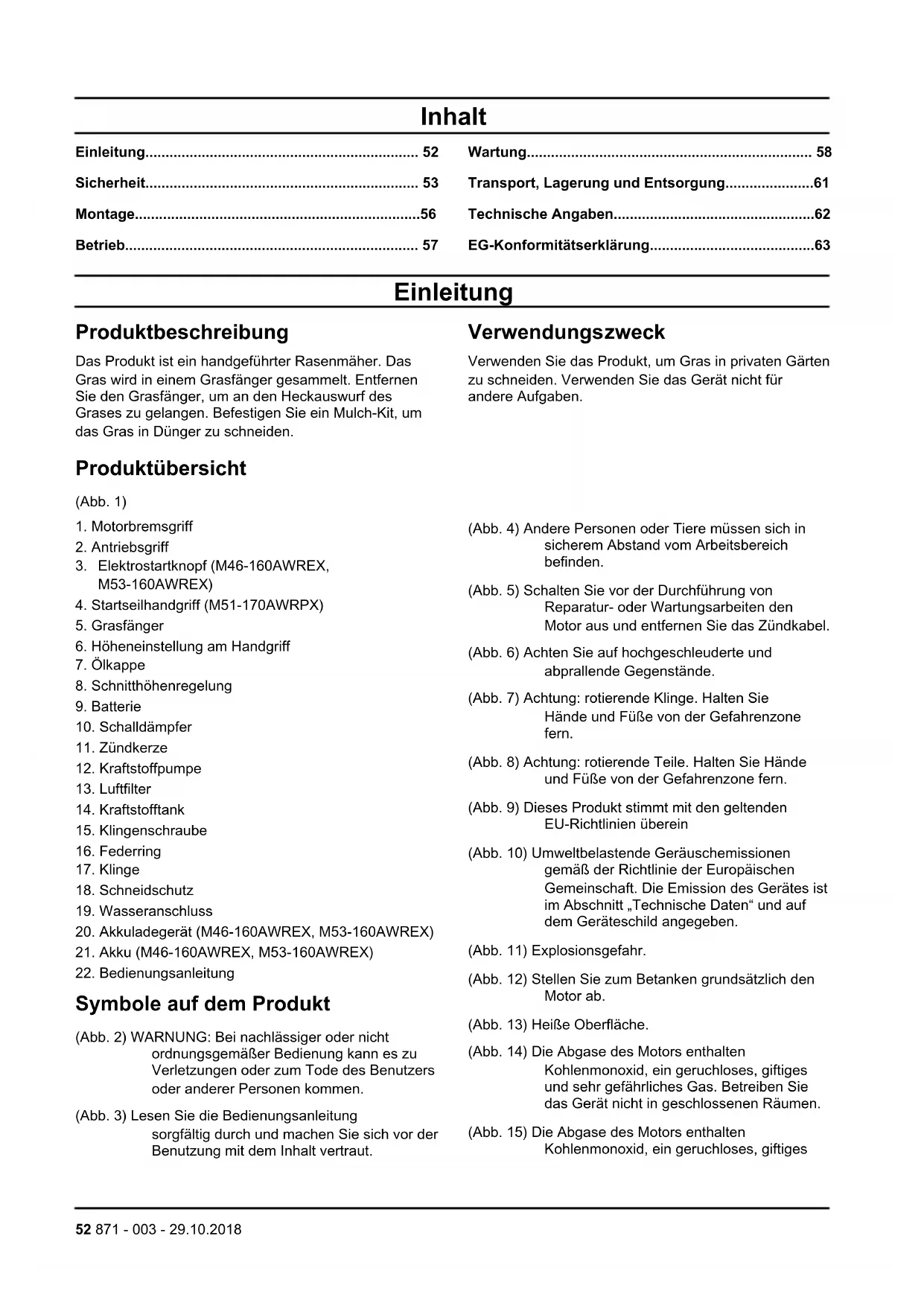 - EG-Konformitätserklärung Einleitung Produktbeschreibung Das Produkt ist ein handgeführter Rasenmäher. Das Gras wird in einem Grasfänger gesammelt. Entfernen Sie den Grasfänger, um an den Heckauswurf des Grases zu gelangen. Befestigen Sie ein Mulch-Kit, um das Gras in Dünger zu schneiden. Verwendungszweck Verwenden Sie das Produkt, um Gras in privaten Gärten zu schneiden. Verwenden Sie das Gerät nicht für andere Aufgaben. Produktübersicht (Abb. 1) p. 63