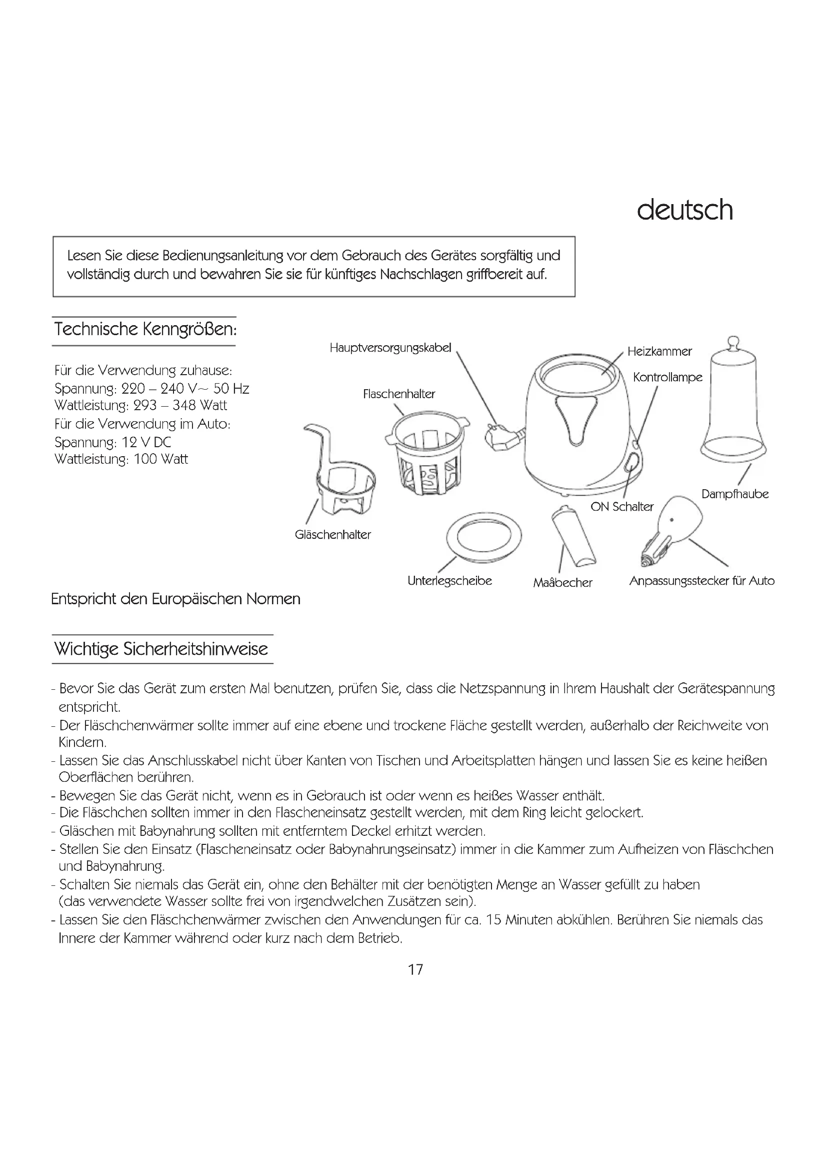 - La bague réglable, les paniers et le gobelet mesureur peuvent être nettoyés à l'aide d'une éponge imbibée d'eau savonneuse ou en lave-vaisselle (plateau supérieur). Détartrage de la cuve: Selon la teneur en calcaire de l'eau utilisée, il peut se former un dépôt sur le fond de la cuve chauffante. Il est conseillé d'effectuer un détartrage régulier : introduire directement dans la cuve un mélange constitué de 100 ml d'eau chaude et de 100 ml de vinaigre blanc ; laisser agir environ 30 minutes ; vider la cuve ; essuyer avec un chiffon humide. Ne pas employer de produits détergents pour nettoyer l'appareil.17 deutsch Unterlegscheibe Flaschenhalter Hauptversorgungskabel Heizkammer Anpassungsstecker für Auto Maâbecher ON Schalter Gläschenhalter Dampfhaube Kontrollampe Lesen Sie diese Bedienungsanleitung vor dem Gebrauch des Gerätes sorgfältig und vollständig durch und bewahren Sie sie für künftiges Nachschlagen griffbereit auf. Technische Kenngrößen: Für die Verwendung zuhause: Spannung: 220 – 240 V~ 50 Hz Wattleistung: 293 – 348 Watt Für die Verwendung im Auto: Spannung: 12 V DC Wattleistung: 100 Watt Entspricht den Europäischen Normen Wichtige Sicherheitshinweise - Bevor Sie das Gerät zum ersten Mal benutzen, prüfen Sie, dass die Netzspannung in Ihrem Haushalt der Gerätespannung entspricht. - Der Fläschchenwärmer sollte immer auf eine ebene und trockene Fläche gestellt werden, außerhalb der Reichweite von Kindern. - Lassen Sie das Anschlusskabel nicht über Kanten von Tischen und Arbeitsplatten hängen und lassen Sie es keine heißen Oberflächen berühren. - Bewegen Sie das Gerät nicht, wenn es in Gebrauch ist oder wenn es heißes Wasser enthält. - Die Fläschchen sollten immer in den Flascheneinsatz gestellt werden, mit dem Ring leicht gelockert. - Gläschen mit Babynahrung sollten mit entferntem Deckel erhitzt werden. - Stellen Sie den Einsatz (Flascheneinsatz oder Babynahrungseinsatz) immer in die Kammer zum Aufheizen von Fläschchen und Babynahrung. - Schalten Sie niemals das Gerät ein, ohne den Behälter mit der benötigten Menge an Wasser gefüllt zu haben (das verwendete Wasser sollte frei von irgendwelchen Zusätzen sein). - Lassen Sie den Fläschchenwärmer zwischen den Anwendungen für ca. 15 Minuten abkühlen. Berühren Sie niemals das Innere der Kammer während oder kurz nach dem Betrieb.60 ml 90 ml 120 ml 150 ml 180 ml