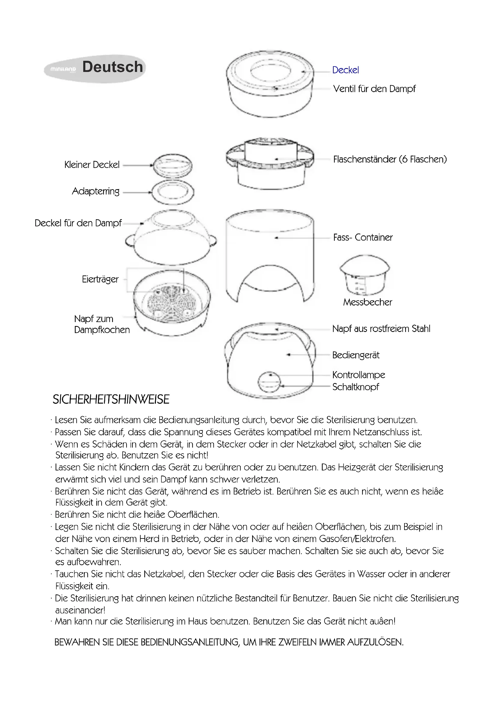 - Lassen Sie nicht Kindern das Gerät zu berühren oder zu benutzen. Das Heizgerät der Sterilisierung erwärmt sich viel und sein Dampf kann schwer verletzen.