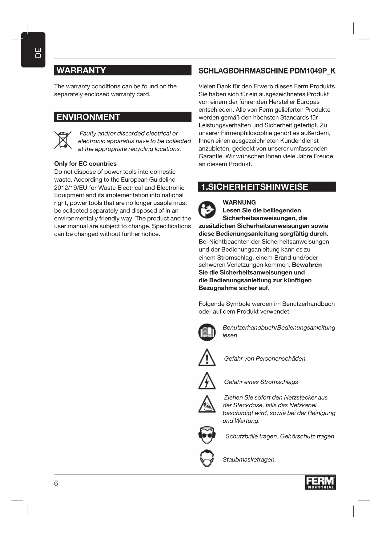 Vielen Dank für den Erwerb dieses Ferm Produkts. Sie haben sich für ein ausgezeichnetes Produkt von einem der führenden Hersteller Europas entschieden. Alle von Ferm gelieferten Produkte werden gemäß den höchsten Standards für Leistungsverhalten und Sicherheit gefertigt. Zu unserer Firmenphilosophie gehört es außerdem, Ihnen einen ausgezeichneten Kundendienst anzubieten, gedeckt von unserer umfassenden Garantie. Wir wünschen Ihnen viele Jahre Freude an diesem Produkt.