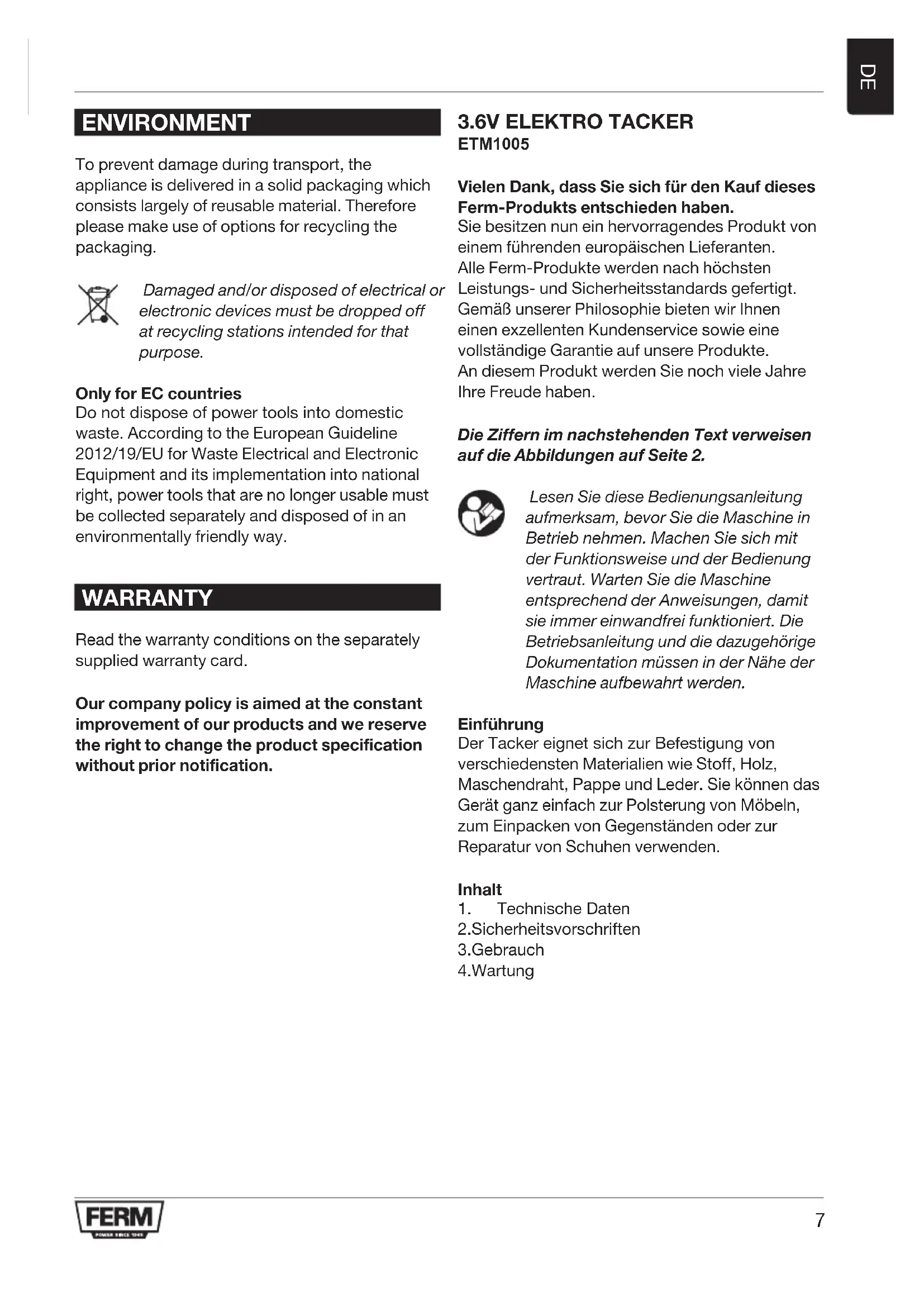 ETM1005 Vielen Dank, dass Sie sich für den Kauf dieses Ferm-Produkts entschieden haben. Sie besitzen nun ein hervorragendes Produkt von einem führenden europäischen Lieferanten. Alle Ferm-Produkte werden nach höchsten Leistungs- und Sicherheitsstandards gefertigt. Gemäß unserer Philosophie bieten wir Ihnen einen exzellenten Kundenservice sowie eine vollständige Garantie auf unsere Produkte. An diesem Produkt werden Sie noch viele Jahre Ihre Freude haben. Die Ziffern im nachstehenden Text verweisen auf die Abbildungen auf Seite 2. Lesen Sie diese Bedienungsanleitung aufmerksam, bevor Sie die Maschine in Betrieb nehmen. Machen Sie sich mit der Funktionsweise und der Bedienung vertraut. Warten Sie die Maschine entsprechend der Anweisungen, damit sie immer einwandfrei funktioniert. Die Betriebsanleitung und die dazugehörige Dokumentation müssen in der Nähe der Maschine aufbewahrt werden. Einführung DerTackereignetsichzurBefestigungvon verschiedensten Materialien wie Stoff, Holz, Maschendraht, Pappe und Leder. Sie können das Gerät ganz einfach zur Polsterung von Möbeln, zum Einpacken von Gegenständen oder zur Reparatur von Schuhen verwenden. Inhalt