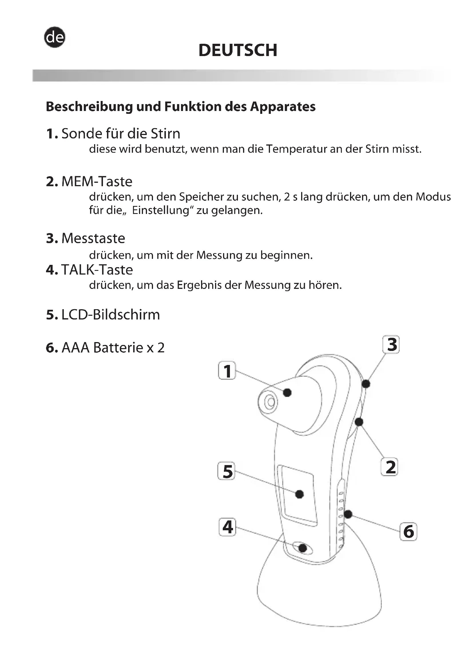 Betrachten Sie die untere Tafel, welche die Warnhinweise und Symbole beschreibt, die in diesem Handbuch erscheinen. Bedeutet die Möglichkeit der Verletzung im Fall einer unkorrekten Handhabung Warnung Bedeutet eine mögliche persönliche Verletzung oder einen Besitzschaden im Fall eines unkorrekten Warnung deBedeutet ‚Nicht kaputt machen' Signale oder Symbole VERBOTBedeutet im Allgemeinen verbotenMUSS ERFÜLLT WERDEN Bedeutet allgemeine VerpflichtungBedeutet, dass das Thermometer nicht die Schutzhülle für die Sonde benötigt. Warnung Das Thermometer darf keinen Extremtemperaturen ausgestzt werden (unter 15ºC/59ºF oder über 40°C/104°F) oder extremer Feuchtigkeit (unter 20 % RH oder über 85 % RH).Wenn diese Normen nicht erfüllt werden, können Ungenauigkeiten entstehen.Das Thermometer darf keinen Extremtemperaturen ausgestzt werden (unter -10ºC/14ºF oder über 55°C/131°F) oder extremer Feuchtigkeit (unter 20 % RH oder über 85 % RH).Wenn diese Normen nicht erfüllt werden, können Ungenauigkeiten entstehen. deEs ist gefährlich, wenn ein Patient eine Selbstbewertung ausführt und eine Behandlung, die auf den Ergebnissen der Abnahme erfolgt. Er muss die Anweisungen eines Arztes befolgen. Eine Selbstbewertung kann die Verschlimmerung von Krankheiten zur Folge haben. Man darf den Infrarot-Sensor nicht berühren oder darauf pusten. Wenn der Infrarot-Sensor schmutzig oder kaputt ist, kann eine ungenaue Ablesung daraus erfolgen. Den Infrarot-Sensor mit einem weichen und trockenen Tuch reinigen. Wenn er mit Toilettenpapier oder einem Papiertaschentuch gereinigt wird, kann der Infrarot-Sensor zerkratzt werden, was ein ungenaues Ablesen verursacht. Bewahren Sie das Gerät außerhalb der Reichweite von Kindern auf. Eine überbeanspruchte Ablesung von Kindern kann dem Ohr Schaden zufügen. Wenn die Batterie oder die Schutzhülle verschluckt werden, müssen Sie sofort einen Arzt aufsuchen. Bei Temperaturunterschieden zwischen dem Aufbewarungsort und dem Ort der Ablesung muss dass Thermometer 30 Minuten bei Zimmertemperatur liegen (an dem Ort, wo die Temperatur gemessen werden soll). Wenn diese Normen nicht erfüllt werden, können Ungenauigkeiten entstehen. Warnung Der Gebrauch des Produktes muss sofort unterlassen werden, wenn ein Schmerz auftritt. Es kann sein, dass eine Verletzung des Ohrs eintritt. Der Gebrauch des Produkts wird nicht empfohlen für Personen, die eine Ohrenentzündung haben, einschließlich Mittelohrentzündung und Trommelfellentzündung. der infizierte Teil kann schlimmer werden. deDas Produkt nicht nach dem Schwimmen oder Baden am Ohr anwenden. das Ohr könnte verletzt werden. Warnung Werfen Sie die Batterien nicht ins Feuer. die Batterie kann explodieren. Empfehlungen - Benutzen Sie das Produkt nicht für einen anderen Gebrauch als den empfohlenen. - Dies ist kein wasserdichter Apparat. Mit einem leicht feuchten Tuch zu reinigen. - Das Produkt darf nicht in Kontakt mit einem chemischen Lösungsmittel, direkter Sonneneinstrahlung oder hohen Temperaturen kommen. - Das Produkt nicht fallen lassen, treten oder Erschütterungen oder Stößen aussetzen. - Kein Mobiltelefon in der Nähe benutzen, wenn das Thermometer gebraucht wird. - Der Umgang mit der Batterie und die Entsorgungsmethode muss den gesetzlichen Regelungen entsprechen. - Die Batterien entfernen, wenn es lange Zeit nicht benutzt wird. Gebrauchsempfehlungen Außer für die Temperaturabnahme am Ohr oder an der Stirn, darf dieses Produkt nicht zu anderen Zwecken gebraucht werden. Man kann es für jede Person benutzen, z. Bsp. ein neugeborenes Baby, Kinder und Erwachsene. deGRUNDFUNKTIONEN