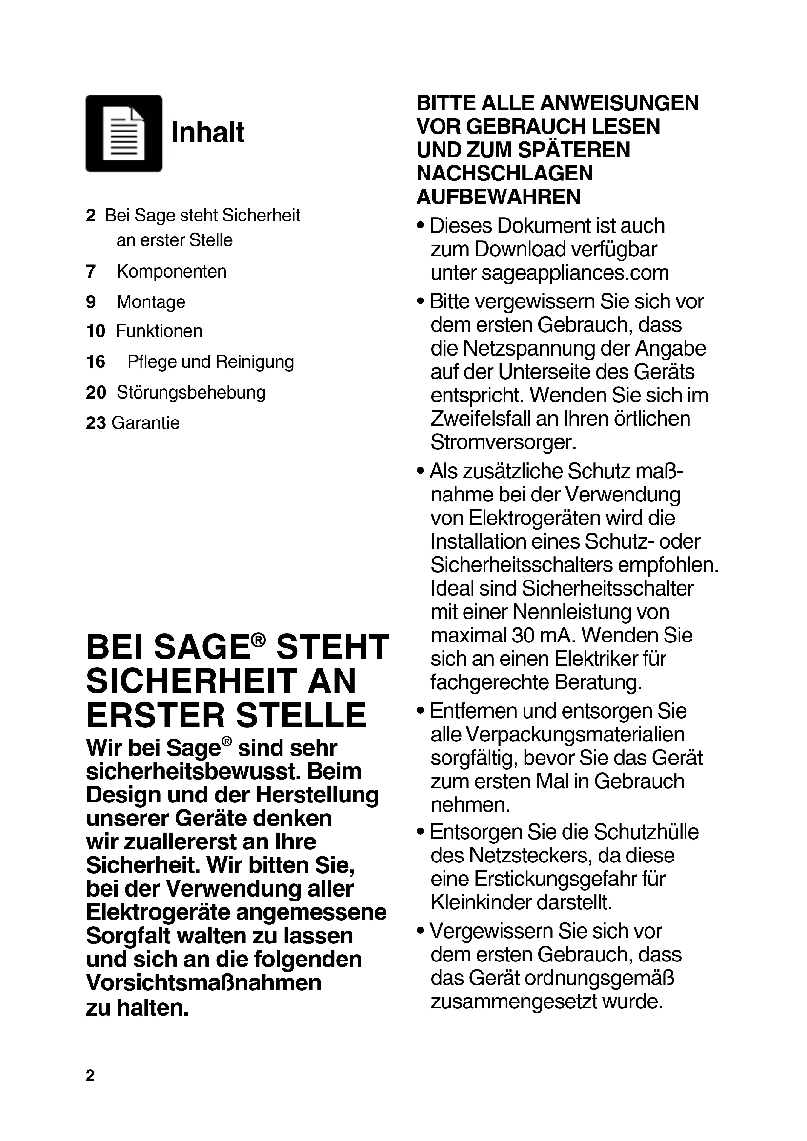 sind sehr sicherheitsbewusst. Beim Design und der Herstellung unserer Geräte denken wir zuallererst an Ihre Sicherheit. Wir bitten Sie, bei der Verwendung aller Elektrogeräte angemessene Sorgfalt walten zu lassen und sich an die folgenden Vorsichtsmaßnahmen zu halten. Inhalt 2 Bei Sage steht Sicherheit an erster Stelle7 Komponenten9 Montage10 Funktionen16 PegeundReinigung20 Störungsbehebung23 Garantie3