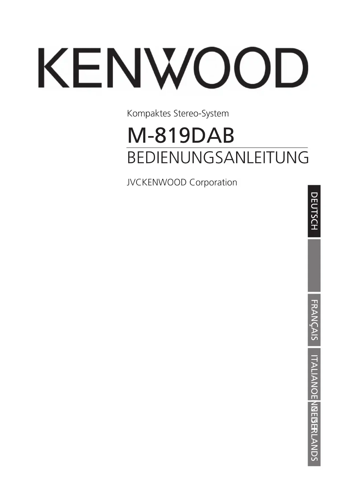 Kompaktes Stereo-System M-819DAB BEDIENUNGSANLEITUNG JVCKENWOOD Corporation DEUTSCH FRANÇAIS ITALIANOENGLISH NEDERLANDSVor der Inbetriebnahme Inhalt Vor Einschalten der Spannungsversorgung Sicherheitshinweise Vor der Inbetriebnahme Anschließen Handhabung von CDs Wissenswertes über USB-Geräte Komponentennamen und –funktionen Grundfunktionen Anschalten des Systems Ausschalten in Standby Lautstärkeregler Einstellen des Klangs Verwendung von CD und USB Vorbereitung Wiedergabe von CD oder Audiodatei (USB, CD) Auswählen eines Ordners (nur Audiodateien) Programmieren von Titeln und Dateien - Vorgehensweise bei Audio-CD - Vorgehensweise bei Audiodateien Zufallswiedergabe und Wiederholungsfunktion - Vorgehensweise bei Audio-CD - Vorgehensweise bei Audiodateien Verwendung des DAB+ Radios Einstellen der DAB+ Sender Anwählen eines DAB+ Senders Speichern von Stationen im Senderspeicher Erweiterte DAB+ Informationen Menüfunktionen DAB+ Verwendung des UKW Radios Einstellen der UKW Sender Speichern von Stationen im Senderspeicher Menüfunktionen UKW Verwendung von BLUETOOTH Koppeln von BLUETOOTH-Geräten Wiedergabe über BLUETOOTH Verwendung von Line-In Abspielen eines externen Zuspielers Störungsbehebung Allgemeine Informationen WartungundPege Entsorgung Technische Daten Garantie