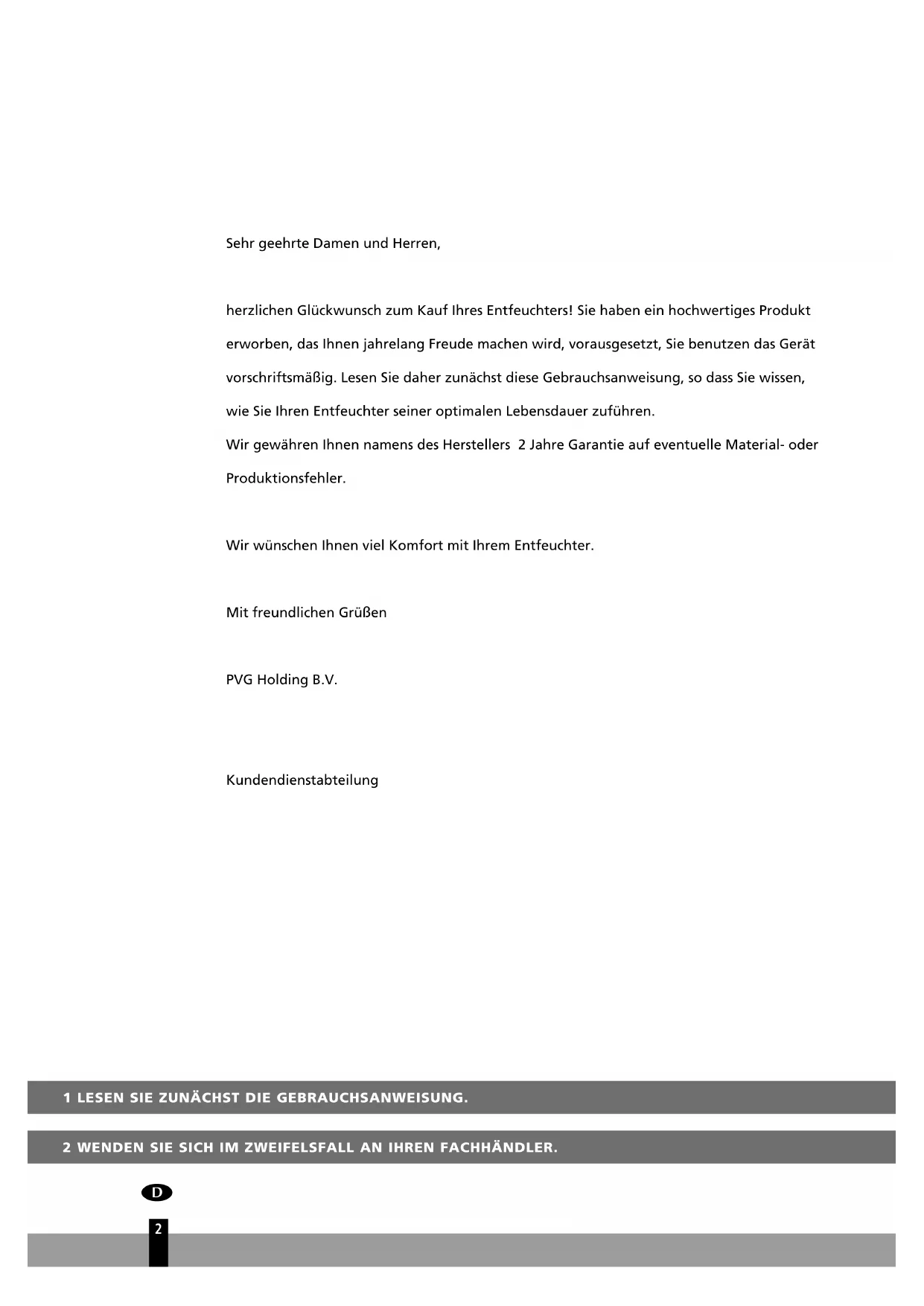 Sehr geehrte Damen und Herren, herzlichen Glückwunsch zum Kauf Ihres Entfeuchters! Sie haben ein hochwertiges Produkt erworben, das Ihnen jahrelang Freude machen wird, vorausgesetzt, Sie benutzen das Gerät vorschriftsmäßig. Lesen Sie daher zunächst diese Gebrauchsanweisung, so dass Sie wissen, wie Sie Ihren Entfeuchter seiner optimalen Lebensdauer zuführen. Wir gewähren Ihnen namens des Herstellers 2 Jahre Garantie auf eventuelle Material- oder Produktionsfehler. Wir wünschen Ihnen viel Komfort mit Ihrem Entfeuchter. Mit freundlichen Grüßen PVG Holding B.V. KundendienstabteilungHAUPTBAUTEILE Vordere Verkleidung Auslass Griff Bedienfeld Filtergehäuse Hintere Verkleidung Wasserbehälter Gummifüße Netzkabel