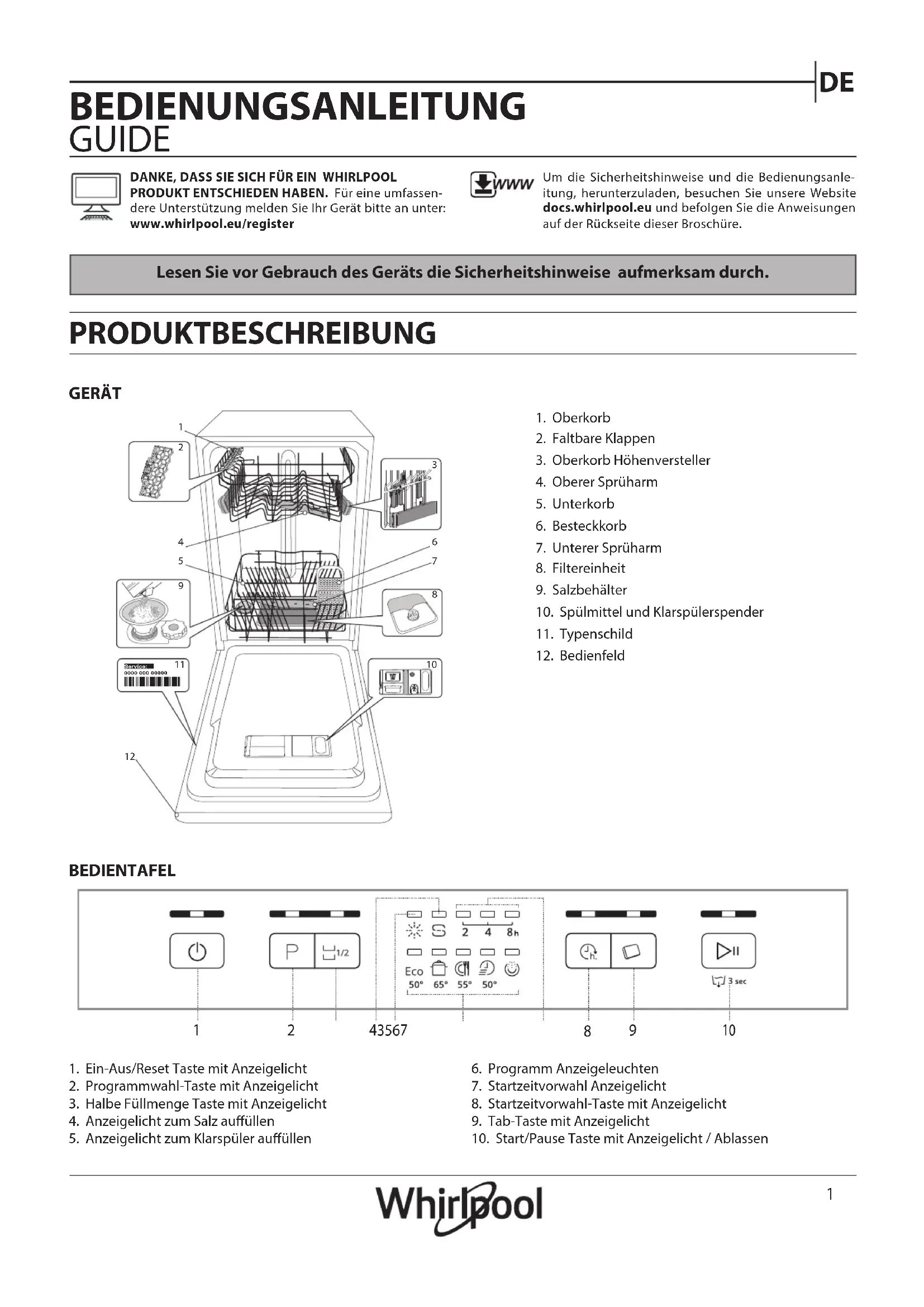 BEDIENTAFEL Lesen Sie vor Gebrauch des Geräts die Sicherheitshinweise aufmerksam durch. GERÄT PRODUKTBESCHREIBUNG BEDIENUNGSANLEITUNG GUIDE DANKE, DASS SIE SICH FÜR EIN WHIRLPOOL PRODUKT ENTSCHIEDEN HABEN. Für eine umfassen-dere Unterstützung melden Sie Ihr Gerät bitte an unter: www.whirlpool.eu/registerUm die Sicherheitshinweise und die Bedienungsanle-itung, herunterzuladen, besuchen Sie unsere Website docs.whirlpool.eu und befolgen Sie die Anweisungen auf der Rückseite dieser Broschüre.1. Oberkorb2. Faltbare Klappen3. Oberkorb Höhenversteller4. Oberer Sprüharm5. Unterkorb6. Besteckkorb7. Unterer Sprüharm8. Filtereinheit9. Salzbehälter10. Spülmittel und Klarspülerspender11. Typenschild12. Bedienfeld1. Ein-Aus/Reset Taste mit Anzeigelicht2. Programmwahl-Taste mit Anzeigelicht3. Halbe Füllmenge Taste mit Anzeigelicht4. Anzeigelicht zum Salz auüllen5. Anzeigelicht zum Klarspüler auüllen6. Programm Anzeigeleuchten7. Startzeitvorwahl Anzeigelicht8. Startzeitvorwahl-Taste mit Anzeigelicht9. Tab-Taste mit Anzeigelicht10. Start/Pause Taste mit Anzeigelicht / Ablassen