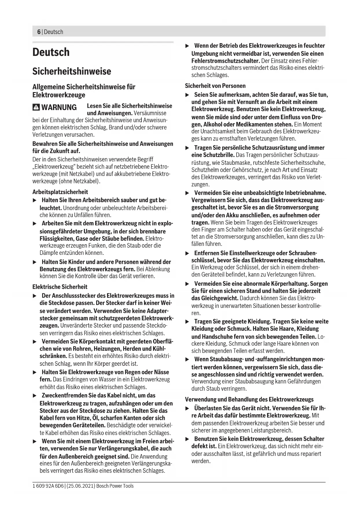 (24) (11) (25) (16) Bosch Power Tools 1 609 92A 6D6 | (25.06.2021)6 | Deutsch Deutsch Sicherheitshinweise Allgemeine Sicherheitshinweise für Elektrowerkzeuge WARNUNG Lesen Sie alle Sicherheitshinweise und Anweisungen. Versäumnisse bei der Einhaltung der Sicherheitshinweise und Anweisun- gen können elektrischen Schlag, Brand und/oder schwere Verletzungen verursachen. Bewahren Sie alle Sicherheitshinweise und Anweisungen für die Zukunft auf. Der in den Sicherheitshinweisen verwendete Begriff „Elektrowerkzeug“ bezieht sich auf netzbetriebene Elektro- werkzeuge (mit Netzkabel) und auf akkubetriebene Elektro- werkzeuge (ohne Netzkabel). Arbeitsplatzsicherheit u Halten Sie Ihren Arbeitsbereich sauber und gut be- leuchtet. Unordnung oder unbeleuchtete Arbeitsberei- che können zu Unfällen führen. u Arbeiten Sie mit dem Elektrowerkzeug nicht in explo- sionsgefährdeter Umgebung, in der sich brennbare Flüssigkeiten, Gase oder Stäube befinden. Elektro- werkzeuge erzeugen Funken, die den Staub oder die Dämpfe entzünden können. u Halten Sie Kinder und andere Personen während der Benutzung des Elektrowerkzeugs fern. Bei Ablenkung können Sie die Kontrolle über das Gerät verlieren. Elektrische Sicherheit u Der Anschlussstecker des Elektrowerkzeuges muss in die Steckdose passen. Der Stecker darf in keiner Wei- se verändert werden. Verwenden Sie keine Adapter- stecker gemeinsam mit schutzgeerdeten Elektrowerk- zeugen. Unveränderte Stecker und passende Steckdo- sen verringern das Risiko eines elektrischen Schlages. u Vermeiden Sie Körperkontakt mit geerdeten Oberflä- chen wie von Rohren, Heizungen, Herden und Kühl- schränken. Es besteht ein erhöhtes Risiko durch elektri- schen Schlag, wenn Ihr Körper geerdet ist. u Halten Sie Elektrowerkzeuge von Regen oder Nässe fern. Das Eindringen von Wasser in ein Elektrowerkzeug erhöht das Risiko eines elektrischen Schlages. u Zweckentfremden Sie das Kabel nicht, um das Elektrowerkzeug zu tragen, aufzuhängen oder um den Stecker aus der Steckdose zu ziehen. Halten Sie das Kabel fern von Hitze, Öl, scharfen Kanten oder sich bewegenden Geräteteilen. Beschädigte oder verwickel- te Kabel erhöhen das Risiko eines elektrischen Schlages. u Wenn Sie mit einem Elektrowerkzeug im Freien arbei- ten, verwenden Sie nur Verlängerungskabel, die auch für den Außenbereich geeignet sind. Die Anwendung eines für den Außenbereich geeigneten Verlängerungska- bels verringert das Risiko eines elektrischen Schlages. u Wenn der Betrieb des Elektrowerkzeuges in feuchter Umgebung nicht vermeidbar ist, verwenden Sie einen Fehlerstromschutzschalter. Der Einsatz eines Fehler- stromschutzschalters vermindert das Risiko eines elektri- schen Schlages. Sicherheit von Personen u Seien Sie aufmerksam, achten Sie darauf, was Sie tun, und gehen Sie mit Vernunft an die Arbeit mit einem Elektrowerkzeug. Benutzen Sie kein Elektrowerkzeug, wenn Sie müde sind oder unter dem Einfluss von Dro- gen, Alkohol oder Medikamenten stehen. Ein Moment der Unachtsamkeit beim Gebrauch des Elektrowerkzeu- ges kann zu ernsthaften Verletzungen führen. u Tragen Sie persönliche Schutzausrüstung und immer eine Schutzbrille. Das Tragen persönlicher Schutzaus- rüstung, wie Staubmaske, rutschfeste Sicherheitsschuhe, Schutzhelm oder Gehörschutz, je nach Art und Einsatz des Elektrowerkzeuges, verringert das Risiko von Verlet- zungen. u Vermeiden Sie eine unbeabsichtigte Inbetriebnahme. Vergewissern Sie sich, dass das Elektrowerkzeug aus- geschaltet ist, bevor Sie es an die Stromversorgung und/oder den Akku anschließen, es aufnehmen oder tragen. Wenn Sie beim Tragen des Elektrowerkzeuges den Finger am Schalter haben oder das Gerät eingeschal- tet an die Stromversorgung anschließen, kann dies zu Un- fällen führen. u Entfernen Sie Einstellwerkzeuge oder Schrauben- schlüssel, bevor Sie das Elektrowerkzeug einschalten. Ein Werkzeug oder Schlüssel, der sich in einem drehen- den Geräteteil befindet, kann zu Verletzungen führen. u Vermeiden Sie eine abnormale Körperhaltung. Sorgen Sie für einen sicheren Stand und halten Sie jederzeit das Gleichgewicht. Dadurch können Sie das Elektro- werkzeug in unerwarteten Situationen besser kontrollie- ren. u Tragen Sie geeignete Kleidung. Tragen Sie keine weite Kleidung oder Schmuck. Halten Sie Haare, Kleidung und Handschuhe fern von sich bewegenden Teilen. Lo- ckere Kleidung, Schmuck oder lange Haare können von sich bewegenden Teilen erfasst werden. u Wenn Staubabsaug- und -auffangeinrichtungen mon- tiert werden können, vergewissern Sie sich, dass die- se angeschlossen sind und richtig verwendet werden. Verwendung einer Staubabsaugung kann Gefährdungen durch Staub verringern. Verwendung und Behandlung des Elektrowerkzeugs u Überlasten Sie das Gerät nicht. Verwenden Sie für Ih- re Arbeit das dafür bestimmte Elektrowerkzeug. Mit dem passenden Elektrowerkzeug arbeiten Sie besser und sicherer im angegebenen Leistungsbereich. u Benutzen Sie kein Elektrowerkzeug, dessen Schalter defekt ist. Ein Elektrowerkzeug, das sich nicht mehr ein- oder ausschalten lässt, ist gefährlich und muss repariert werden. 1 609 92A 6D6 | (25.06.2021) Bosch Power ToolsDeutsch | 7 u Ziehen Sie den Stecker aus der Steckdose und/oder entfernen Sie den Akku, bevor Sie Geräteeinstellun- gen vornehmen, Zubehörteile wechseln oder das Ge- rät weglegen. Diese Vorsichtsmaßnahme verhindert den unbeabsichtigten Start des Elektrowerkzeuges. u Bewahren Sie unbenutzte Elektrowerkzeuge außer- halb der Reichweite von Kindern auf. Lassen Sie Per- sonen das Gerät nicht benutzen, die mit diesem nicht vertraut sind oder diese Anweisungen nicht gelesen haben. Elektrowerkzeuge sind gefährlich, wenn sie von unerfahrenen Personen benutzt werden. u Pflegen Sie Elektrowerkzeuge mit Sorgfalt. Kontrollie- ren Sie, ob bewegliche Teile einwandfrei funktionie- ren und nicht klemmen, ob Teile gebrochen oder so beschädigt sind, dass die Funktion des Elektrowerk- zeuges beeinträchtigt ist. 