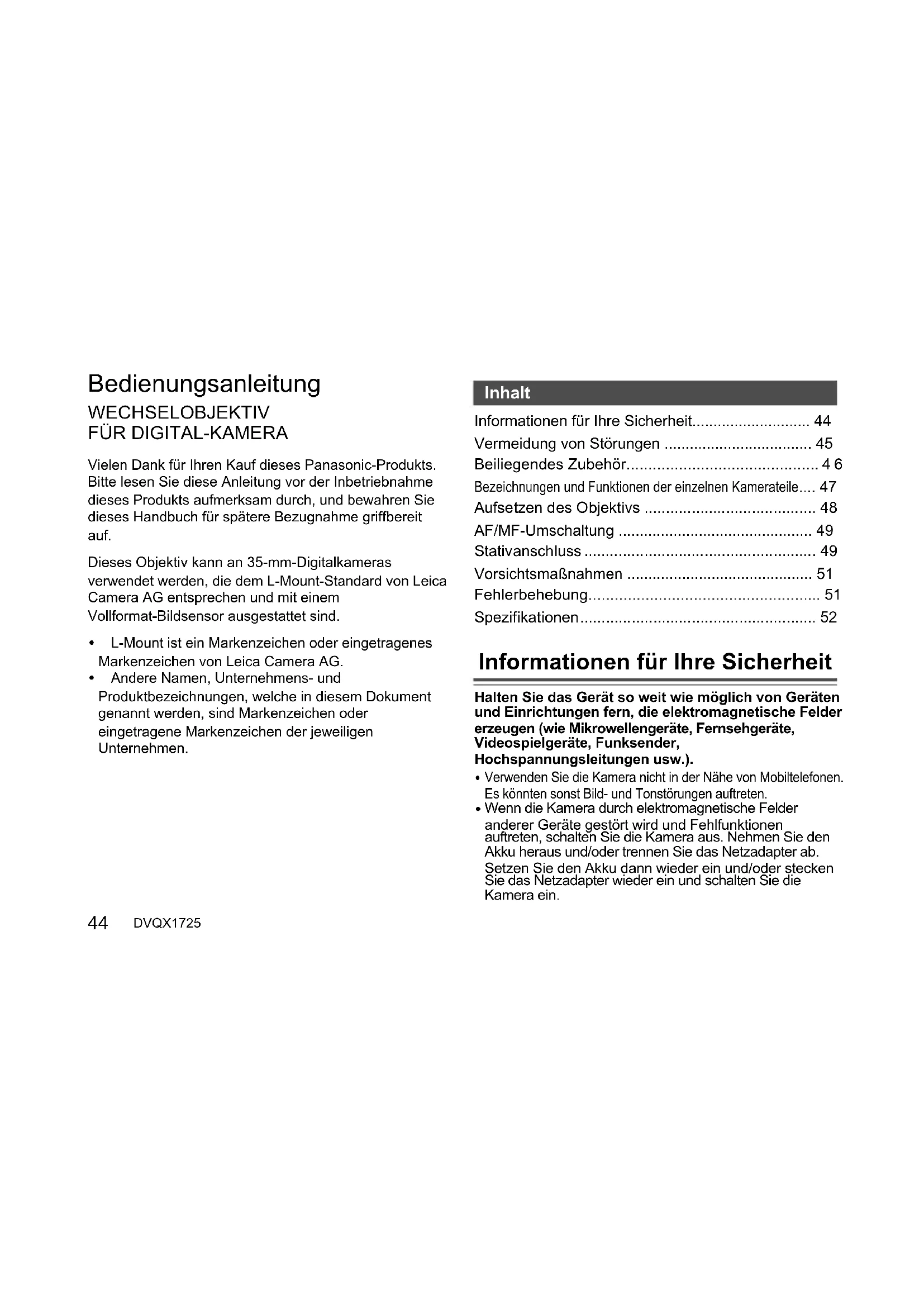 Informationen für Ihre Sicherheit...... 44