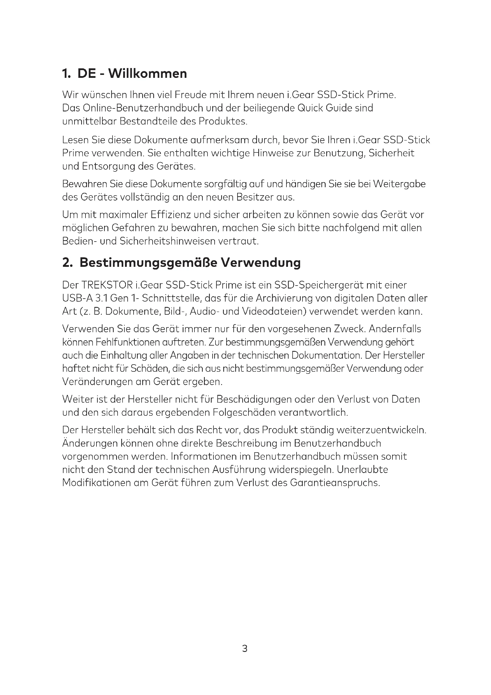 Der TREKSTOR i.Gear SSD-Stick Prime ist ein SSD-Speichergerät mit einer USB-A 3.1 Gen 1- Schnittstelle, das ür die Archivierung von digitalen Daten aller Art (z. B. Dokumente, Bild-, Audio- und Videodateien) verwendet werden kann. Verwenden Sie das Gerät immer nur ür den vorgesehenen Zweck. Andernfalls können Fehlfunktionen auftreten. Zur bestimmungsgemäßen Verwendung gehört auch die Einhaltung aller Angaben in der technischen Dokumentation. Der Hersteller haftet nicht ür Schäden, die sich aus nicht bestimmungsgemäßer Verwendung oder Veränderungen am Gerät ergeben. Weiter ist der Hersteller nicht ür Beschädigungen oder den Verlust von Daten und den sich daraus ergebenden Folgeschäden verantwortlich. Der Hersteller behält sich das Recht vor, das Produkt ständig weiterzuentwickeln. Änderungen können ohne direkte Beschreibung im Benutzerhandbuch vorgenommen werden. Informationen im Benutzerhandbuch müssen somit nicht den Stand der technischen Ausührung widerspiegeln. Unerlaubte Modiikationen am Gerät ühren zum Verlust des Garantieanspruchs.4
