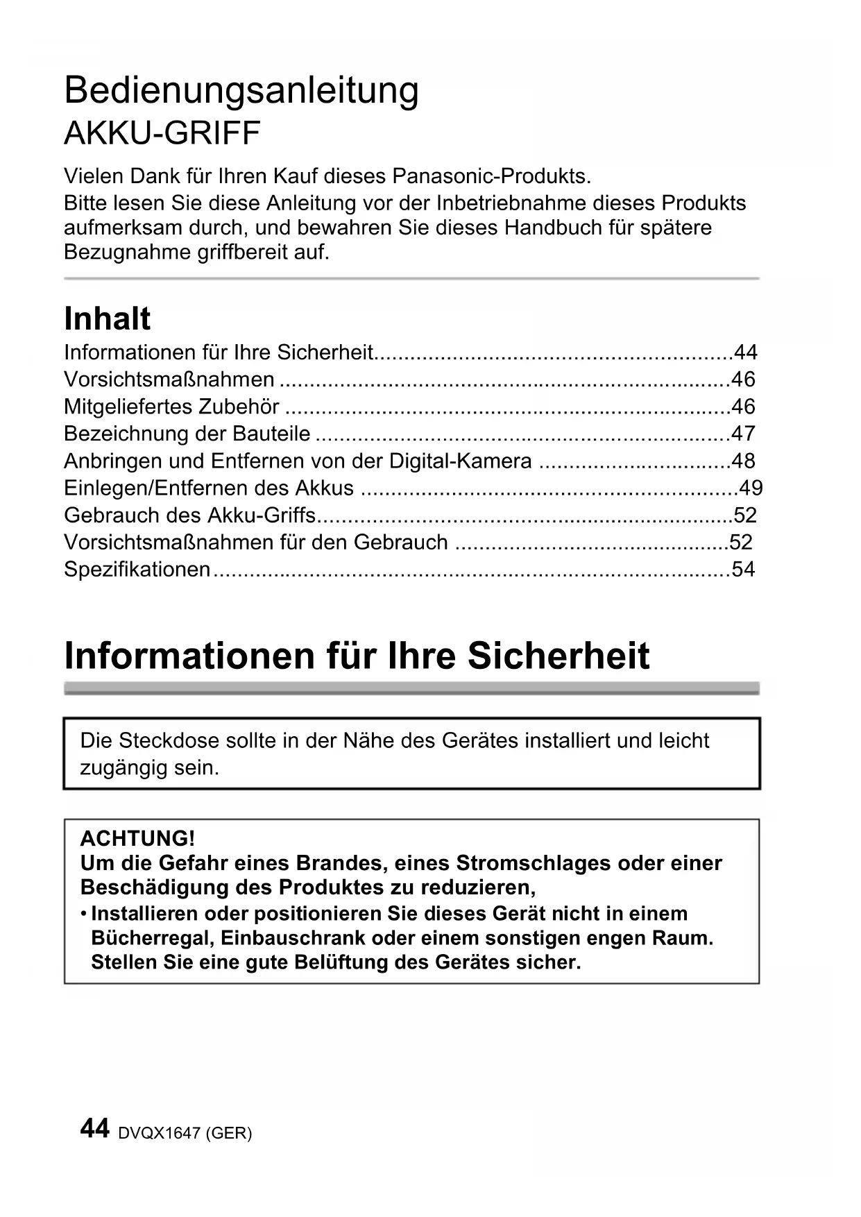 - Bedienungsanleitung AKKU-GRIFF Vielen Dank für Ihren Kauf dieses Panasonic-Produkts. Bitte lesen Sie diese Anleitung vor der Inbetriebnahme dieses Produkts aufmerksam durch, und bewahren Sie dieses Handbuch für spätere Bezugnahme griffbereit auf. Inhalt Informationen für Ihre Sicherheit p. 44