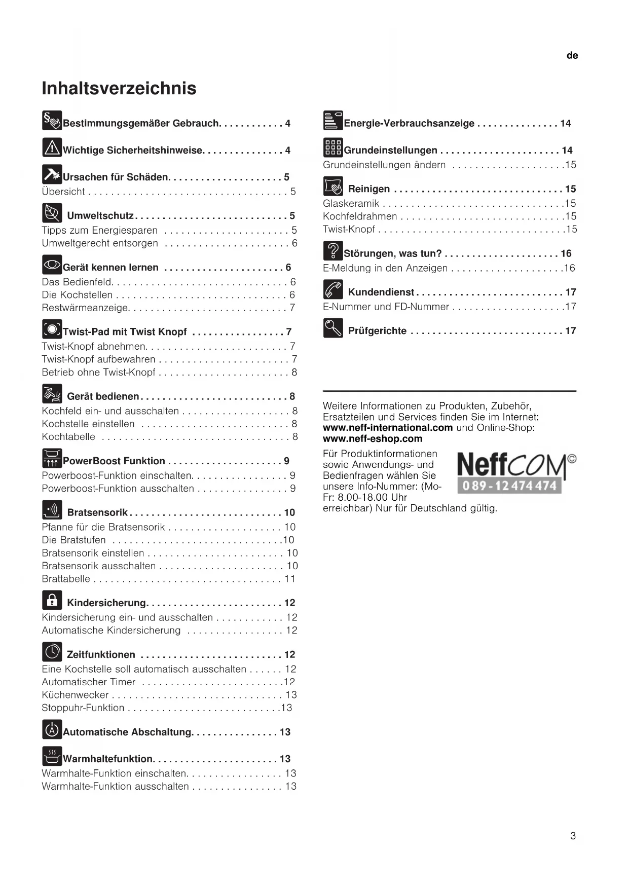 - Gerät kennen lernen . . . . . . . . . . . . . . . . . . . . . . 6 Das Bedienfeld. . . . . . . . . . . . . . . . . . . . . . . . . . . . . . . 6 Die Kochstellen . . . . . . . . . . . . . . . . . . . . . . . . . . . . . . 6 Restwärmeanzeige. . . . . . . . . . . . . . . . . . . . . . . . . . . . 7 j Twist-Pad mit Twist Knopf . . . . . . . . . . . . . . . . . 7 Twist-Knopf abnehmen. . . . . . . . . . . . . . . . . . . . . . . . . 7 Twist-Knopf aufbewahren . . . . . . . . . . . . . . . . . . . . . . . 7 Betrieb ohne Twist-Knopf . . . . . . . . . . . . . . . . . . . . . . . 8 1 Gerät bedienen. . . . . . . . . . . . . . . . . . . . . . . . . . . 8 Kochfeld ein- und ausschalten . . . . . . . . . . . . . . . . . . . 8 Kochstelle einstellen . . . . . . . . . . . . . . . . . . . . . . . . . . 8 Kochtabelle . . . . . . . . . . . . . . . . . . . . . . . . . . . . . . . . . 8 v PowerBoost Funktion . . . . . . . . . . . . . . . . . . . . . 9 Powerboost-Funktion einschalten. . . . . . . . . . . . . . . . . 9 Powerboost-Funktion ausschalten . . . . . . . . . . . . . . . . 9 c Bratsensorik . . . . . . . . . . . . . . . . . . . . . . . . . . . . 10 Pfanne für die Bratsensorik . . . . . . . . . . . . . . . . . . . . 10 Die Bratstufen . . . . . . . . . . . . . . . . . . . . . . . . . . . . . .10 Bratsensorik einstellen . . . . . . . . . . . . . . . . . . . . . . . . 10 Bratsensorik ausschalten . . . . . . . . . . . . . . . . . . . . . . 10 Brattabelle . . . . . . . . . . . . . . . . . . . . . . . . . . . . . . . . . 11 A Kindersicherung. . . . . . . . . . . . . . . . . . . . . . . . . 12 Kindersicherung ein- und ausschalten . . . . . . . . . . . . 12 Automatische Kindersicherung . . . . . . . . . . . . . . . . . 12 O Zeitfunktionen . . . . . . . . . . . . . . . . . . . . . . . . . . 12 Eine Kochstelle soll automatisch ausschalten . . . . . . 12 Automatischer Timer . . . . . . . . . . . . . . . . . . . . . . . . .12 Küchenwecker . . . . . . . . . . . . . . . . . . . . . . . . . . . . . . 13 Stoppuhr-Funktion . . . . . . . . . . . . . . . . . . . . . . . . . . .13 b Automatische Abschaltung. . . . . . . . . . . . . . . . 13 z Warmhaltefunktion. . . . . . . . . . . . . . . . . . . . . . . 13 Warmhalte-Funktion einschalten. . . . . . . . . . . . . . . . . 13 Warmhalte-Funktion ausschalten . . . . . . . . . . . . . . . . 13 [ Energie-Verbrauchsanzeige . . . . . . . . . . . . . . . 14 Q Grundeinstellungen . . . . . . . . . . . . . . . . . . . . . . 14 Grundeinstellungen ändern . . . . . . . . . . . . . . . . . . . .15 D Reinigen . . . . . . . . . . . . . . . . . . . . . . . . . . . . . . . 15 Glaskeramik . . . . . . . . . . . . . . . . . . . . . . . . . . . . . . . .15 Kochfeldrahmen . . . . . . . . . . . . . . . . . . . . . . . . . . . . .15 Twist-Knopf . . . . . . . . . . . . . . . . . . . . . . . . . . . . . . . . .15 3 Störungen, was tun? . . . . . . . . . . . . . . . . . . . . . 16 E-Meldung in den Anzeigen . . . . . . . . . . . . . . . . . . . .16 4 Kundendienst . . . . . . . . . . . . . . . . . . . . . . . . . . . 17 E-Nummer und FD-Nummer . . . . . . . . . . . . . . . . . . . .17 E Prüfgerichte . . . . . . . . . . . . . . . . . . . . . . . . . . . . 17 Produktinfo Weitere Informationen zu Produkten, Zubehör, Ersatzteilen und Services finden Sie im Internet: www.neff-international.com und Online-Shop: www.neff-eshop.com Für Produktinformationen sowie Anwendungs- und Bedienfragen wählen Sie unsere Info-Nummer: (Mo- Fr: 8.00-18.00 Uhr erreichbar) Nur für Deutschland gültig.de Bestimmungsgemäßer Gebrauch