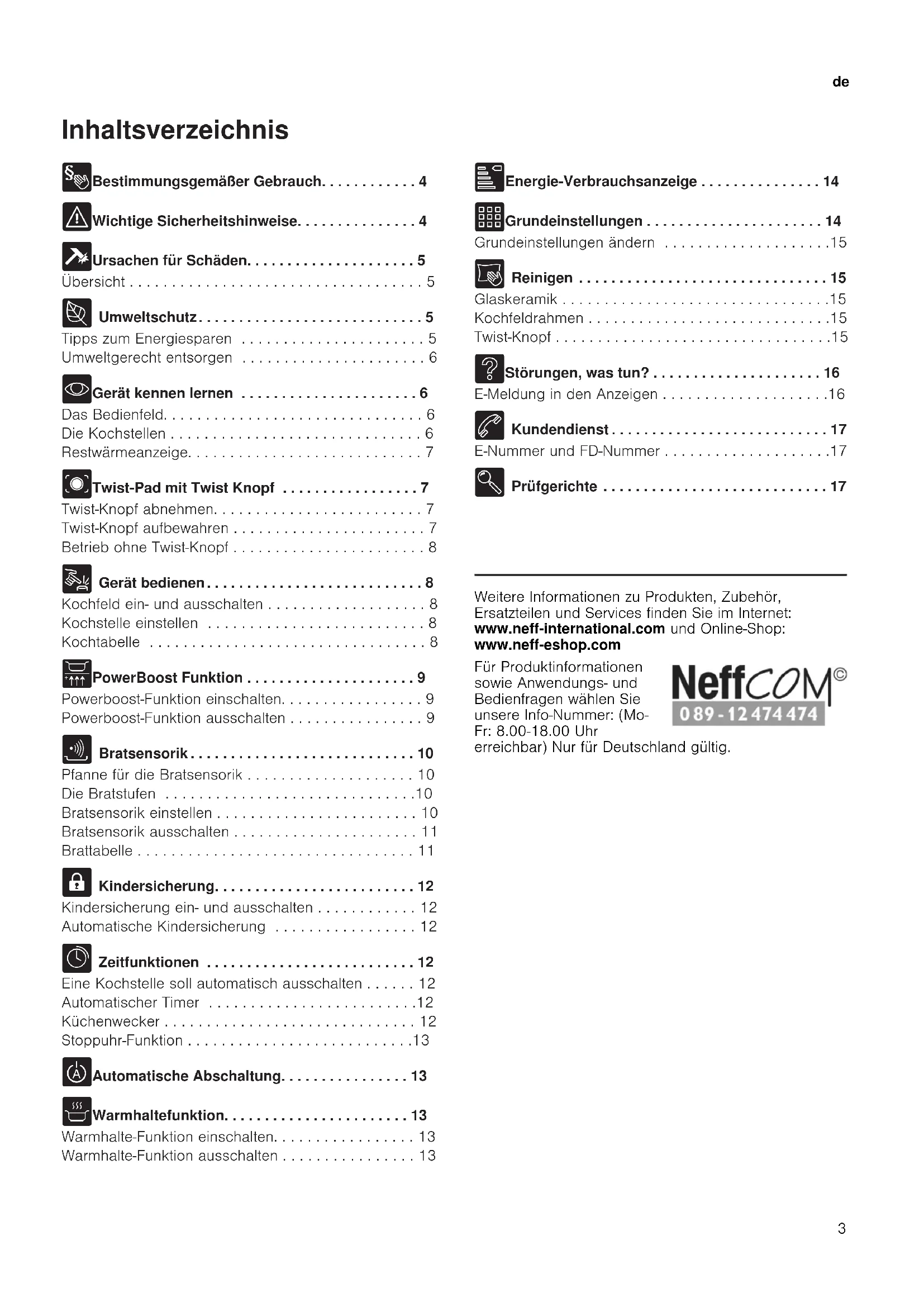 - Gerät kennen lernen . . . . . . . . . . . . . . . . . . . . . . 6 Das Bedienfeld. . . . . . . . . . . . . . . . . . . . . . . . . . . . . . . 6 Die Kochstellen . . . . . . . . . . . . . . . . . . . . . . . . . . . . . . 6 Restwärmeanzeige. . . . . . . . . . . . . . . . . . . . . . . . . . . . 7 j Twist-Pad mit Twist Knopf . . . . . . . . . . . . . . . . . 7 Twist-Knopf abnehmen. . . . . . . . . . . . . . . . . . . . . . . . . 7 Twist-Knopf aufbewahren . . . . . . . . . . . . . . . . . . . . . . . 7 Betrieb ohne Twist-Knopf . . . . . . . . . . . . . . . . . . . . . . . 8 1 Gerät bedienen. . . . . . . . . . . . . . . . . . . . . . . . . . . 8 Kochfeld ein- und ausschalten . . . . . . . . . . . . . . . . . . . 8 Kochstelle einstellen . . . . . . . . . . . . . . . . . . . . . . . . . . 8 Kochtabelle . . . . . . . . . . . . . . . . . . . . . . . . . . . . . . . . . 8 v PowerBoost Funktion . . . . . . . . . . . . . . . . . . . . . 9 Powerboost-Funktion einschalten. . . . . . . . . . . . . . . . . 9 Powerboost-Funktion ausschalten . . . . . . . . . . . . . . . . 9 c Bratsensorik . . . . . . . . . . . . . . . . . . . . . . . . . . . . 10 Pfanne für die Bratsensorik . . . . . . . . . . . . . . . . . . . . 10 Die Bratstufen . . . . . . . . . . . . . . . . . . . . . . . . . . . . . .10 Bratsensorik einstellen . . . . . . . . . . . . . . . . . . . . . . . . 10 Bratsensorik ausschalten . . . . . . . . . . . . . . . . . . . . . . 11 Brattabelle . . . . . . . . . . . . . . . . . . . . . . . . . . . . . . . . . 11 A Kindersicherung. . . . . . . . . . . . . . . . . . . . . . . . . 12 Kindersicherung ein- und ausschalten . . . . . . . . . . . . 12 Automatische Kindersicherung . . . . . . . . . . . . . . . . . 12 O Zeitfunktionen . . . . . . . . . . . . . . . . . . . . . . . . . . 12 Eine Kochstelle soll automatisch ausschalten . . . . . . 12 Automatischer Timer . . . . . . . . . . . . . . . . . . . . . . . . .12 Küchenwecker . . . . . . . . . . . . . . . . . . . . . . . . . . . . . . 12 Stoppuhr-Funktion . . . . . . . . . . . . . . . . . . . . . . . . . . .13 b Automatische Abschaltung. . . . . . . . . . . . . . . . 13 z Warmhaltefunktion. . . . . . . . . . . . . . . . . . . . . . . 13 Warmhalte-Funktion einschalten. . . . . . . . . . . . . . . . . 13 Warmhalte-Funktion ausschalten . . . . . . . . . . . . . . . . 13 [ Energie-Verbrauchsanzeige . . . . . . . . . . . . . . . 14 Q Grundeinstellungen . . . . . . . . . . . . . . . . . . . . . . 14 Grundeinstellungen ändern . . . . . . . . . . . . . . . . . . . .15 D Reinigen . . . . . . . . . . . . . . . . . . . . . . . . . . . . . . . 15 Glaskeramik . . . . . . . . . . . . . . . . . . . . . . . . . . . . . . . .15 Kochfeldrahmen . . . . . . . . . . . . . . . . . . . . . . . . . . . . .15 Twist-Knopf . . . . . . . . . . . . . . . . . . . . . . . . . . . . . . . . .15 3 Störungen, was tun? . . . . . . . . . . . . . . . . . . . . . 16 E-Meldung in den Anzeigen . . . . . . . . . . . . . . . . . . . .16 4 Kundendienst . . . . . . . . . . . . . . . . . . . . . . . . . . . 17 E-Nummer und FD-Nummer . . . . . . . . . . . . . . . . . . . .17 E Prüfgerichte . . . . . . . . . . . . . . . . . . . . . . . . . . . . 17 Produktinfo Weitere Informationen zu Produkten, Zubehör, Ersatzteilen und Services finden Sie im Internet: www.neff-international.com und Online-Shop: www.neff-eshop.com Für Produktinformationen sowie Anwendungs- und Bedienfragen wählen Sie unsere Info-Nummer: (Mo- Fr: 8.00-18.00 Uhr erreichbar) Nur für Deutschland gültig.de Bestimmungsgemäßer Gebrauch