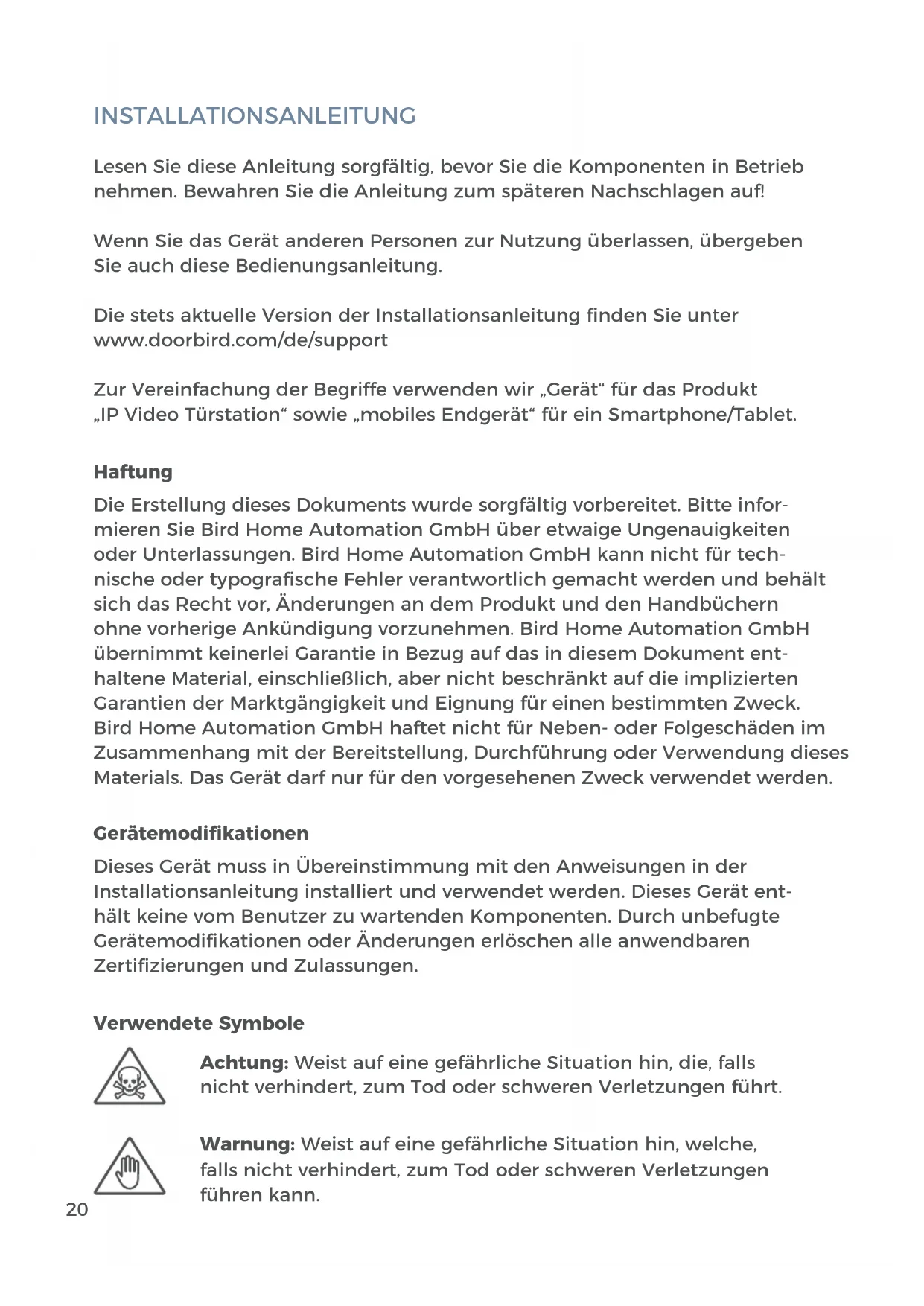 - The device may come with a visitor history and motion sensor. You can activate/deactivate this function if required. If necessary, indicate the presence of the device in a suitable place and in a suitable form. Please observe any relevant country-specific statutory regulations concerning the use of surveillance components and surveillance cameras applicable at the installation site. Check with the property owner and your house community if you are allowed to install and use this product. Bird Home Automation GmbH cannot be held responsible for any miss-use or miss-configuration of this product, including the unauthorized opening of a door. Bird Home Automation cannot be held responsible for damages caused by improper existing installations or improper installation. Software and operating system’s updates (so-called „firmware updates“) are generally automatically installed on the products of Bird Home Automation GmbH via Internet, if technically possible. Automatic firmware updates keep the products‘ software up to date so that they always work reliably, safely and efficiently. Through further development, features can be added, extended or slightly changed. Major changes or limitations to existing features will generally occur if Bird Home Automation GmbH deems it necessary (e.g. for data protection, data security or stability reasons, or to keep them up to date). When a firmware update is available, Bird Home Automation GmbH‘s servers generally automatically distribute it to all compatible products connected to the Internet or Bird Home Automation GmbH‘s servers. This process is gradual and can take several weeks. As soon as a product receives a firmware update, the system will be installed and will restart by itself. Installed firmware updates cannot be undone. Since the products and software of Bird Home Automation GmbH are not explicitly customer- specific products, a customer cannot deny an automatic update if the product is connected to the Internet or to the Bird Home Automation GmbH’s server. Instructions for disposal Do not dispose of the device with regular domestic waste. Electronic equipment must be disposed e.g. at local collection points for waste electronic equipment in compliance with the Waste Elec trical and Electronic Equipment Directive. Publisher Bird Home Automation GmbH Uhlandstraße 165 10719 Berlin Germany Web: www.doorbird.com Email: hello@doorbird.com20 INSTALLATIONSANLEITUNG Lesen Sie diese Anleitung sorgfältig, bevor Sie die Komponenten in Betrieb nehmen. Bewahren Sie die Anleitung zum späteren Nachschlagen auf! Wenn Sie das Gerät anderen Personen zur Nutzung überlassen, übergeben Sie auch diese Bedienungsanleitung. Die stets aktuelle Version der Installationsanleitung finden Sie unter www.doorbird.com/de/support Zur Vereinfachung der Begriffe verwenden wir „Gerät“ für das Produkt „IP Video Türstation“ sowie „mobiles Endgerät“ für ein Smartphone/Tablet. Haftung Die Erstellung dieses Dokuments wurde sorgfältig vorbereitet. Bitte infor- mieren Sie Bird Home Automation GmbH über etwaige Ungenauigkeiten oder Unterlassungen. Bird Home Automation GmbH kann nicht für tech- nische oder typografische Fehler verantwortlich gemacht werden und behält sich das Recht vor, Änderungen an dem Produkt und den Handbüchern ohne vorherige Ankündigung vorzunehmen. Bird Home Automation GmbH übernimmt keinerlei Garantie in Bezug auf das in diesem Dokument ent- haltene Material, einschließlich, aber nicht beschränkt auf die implizierten Garantien der Marktgängigkeit und Eignung für einen bestimmten Zweck. Bird Home Automation GmbH haftet nicht für Neben- oder Folgeschäden im Zusammenhang mit der Bereitstellung, Durchführung oder Verwendung dieses Materials. Das Gerät darf nur für den vorgesehenen Zweck verwendet werden. Gerätemodifikationen Dieses Gerät muss in Übereinstimmung mit den Anweisungen in der Installationsanleitung installiert und verwendet werden. Dieses Gerät ent- hält keine vom Benutzer zu wartenden Komponenten. Durch unbefugte Gerätemodifikationen oder Änderungen erlöschen alle anwendbaren Zertifizierungen und Zulassungen. Verwendete Symbole Achtung: Weist auf eine gefährliche Situation hin, die, falls nicht verhindert, zum Tod oder schweren Verletzungen führt. Warnung: Weist auf eine gefährliche Situation hin, welche, falls nicht verhindert, zum Tod oder schweren Verletzungen führen kann.DEUTSCH
