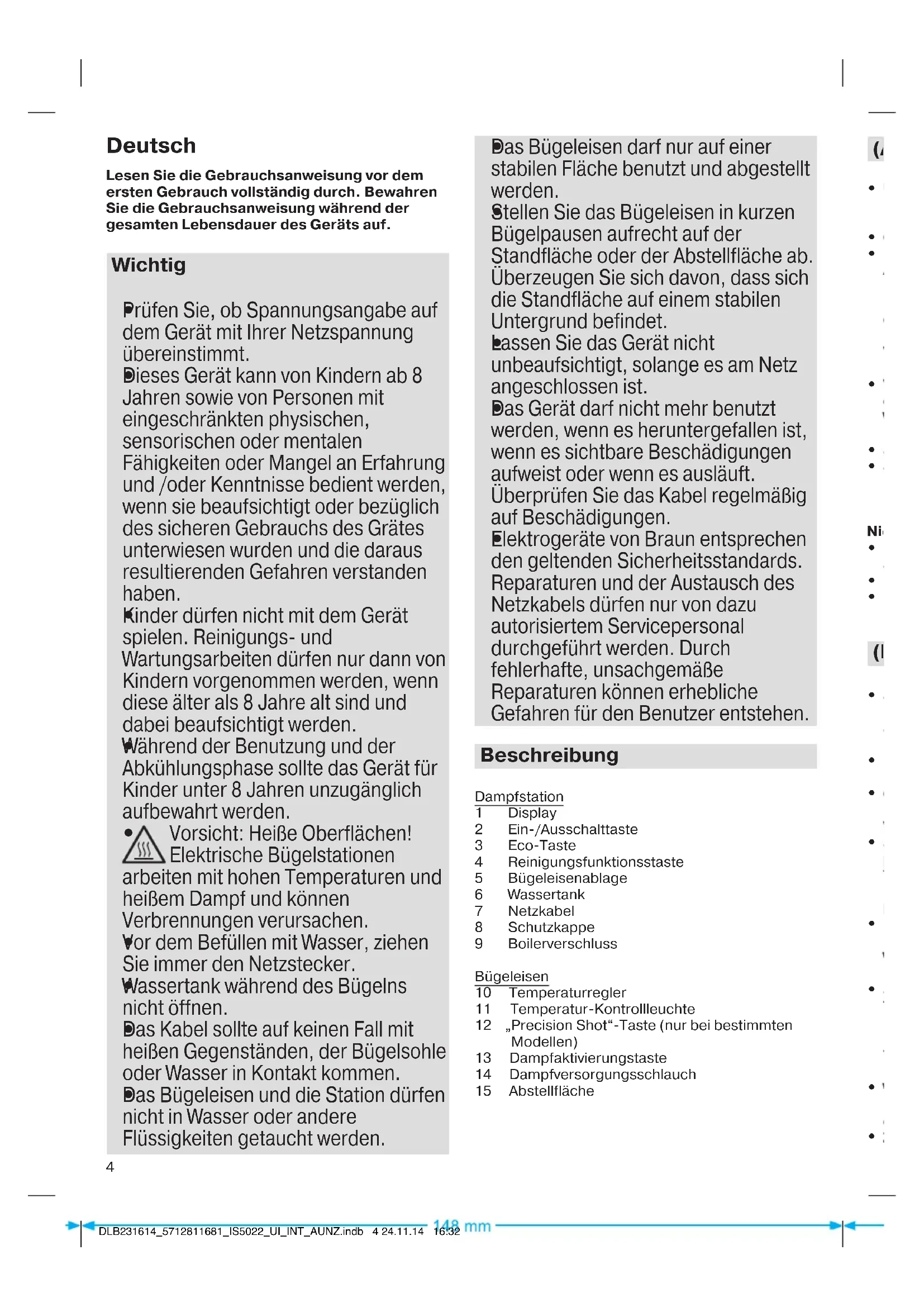 Das Bügeleisen und die Station dürfen nicht in Wasser oder andere Flüssigkeiten getaucht werden.