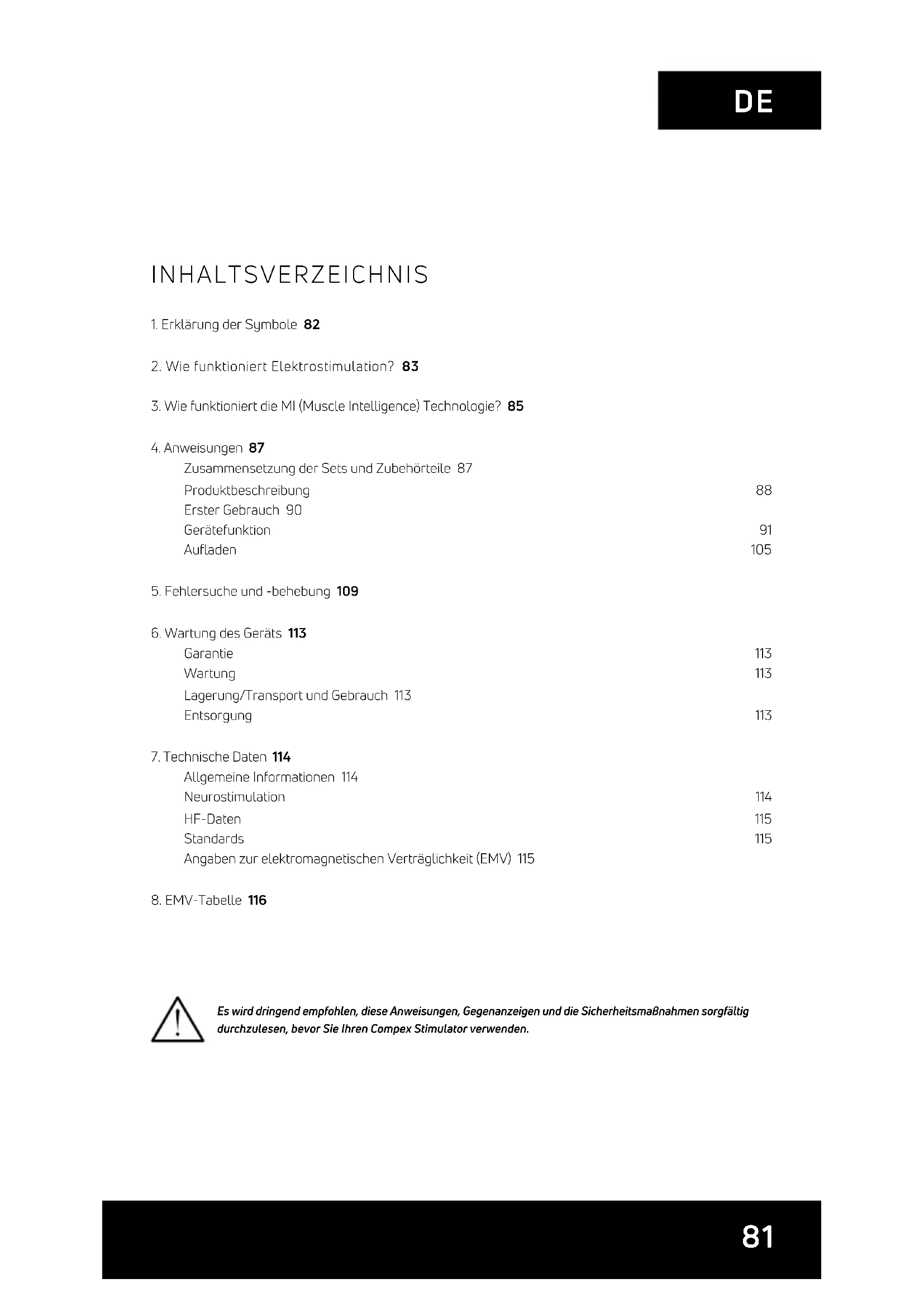 INHALTSVERZEICHNIS Es wird dringend empfohlen, diese Anweisungen, Gegenanzeigen und die Sicherheitsmaßnahmen sorgfältig durchzulesen, bevor Sie Ihren Compex Stimulator verwenden.