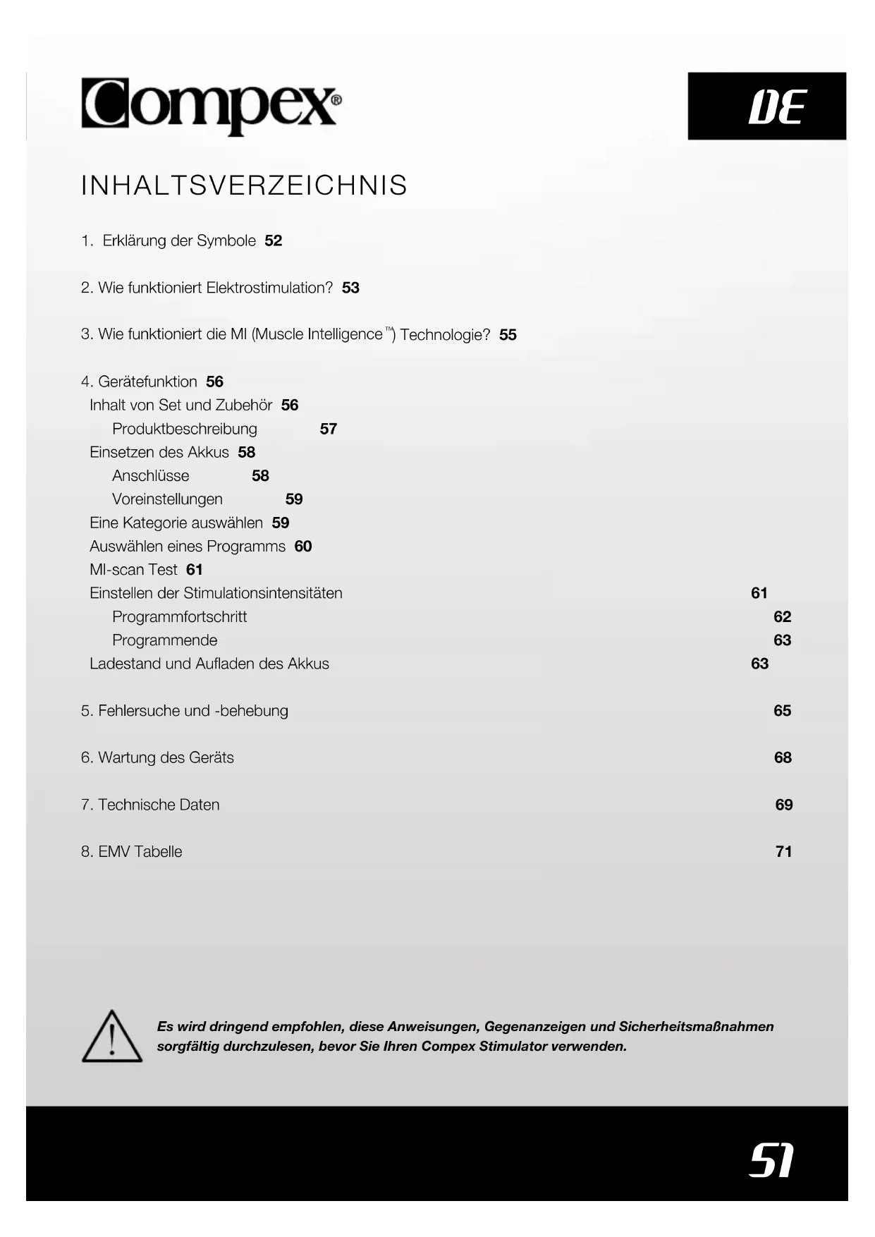 Es wird dringend empfohlen, diese Anweisungen, Gegenanzeigen und Sicherheitsmaßnahmen sorgfältig durchzulesen, bevor Sie Ihren Compex Stimulator verwenden.52