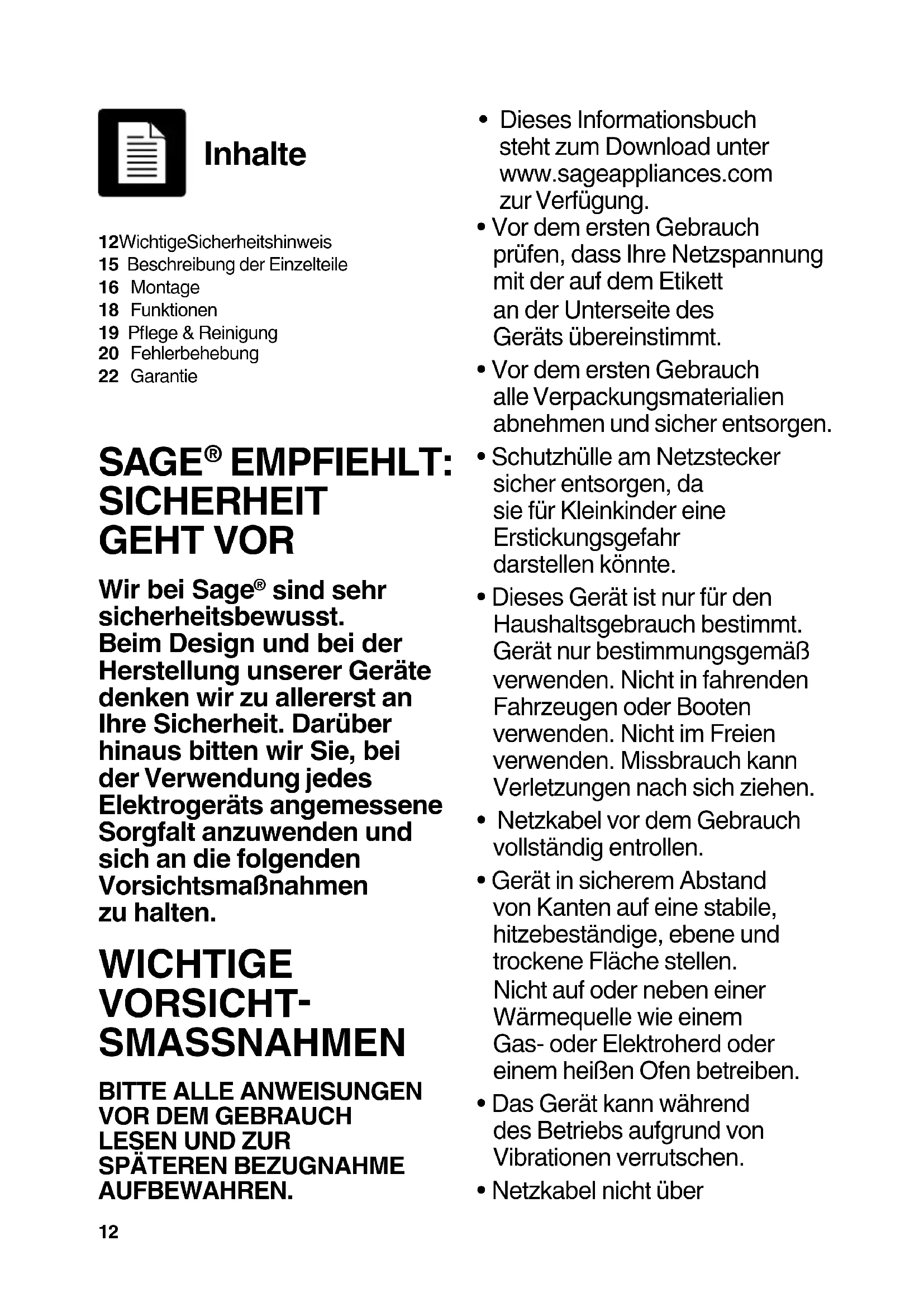 - Netzkabel nicht über 12 Wichtige Sicherheits hinweis15 Beschreibung der Einzelteile16 Montage18 Funktionen19 Pege & Reinigung20 Fehlerbehebung22 Garantie Inhalte SAGE