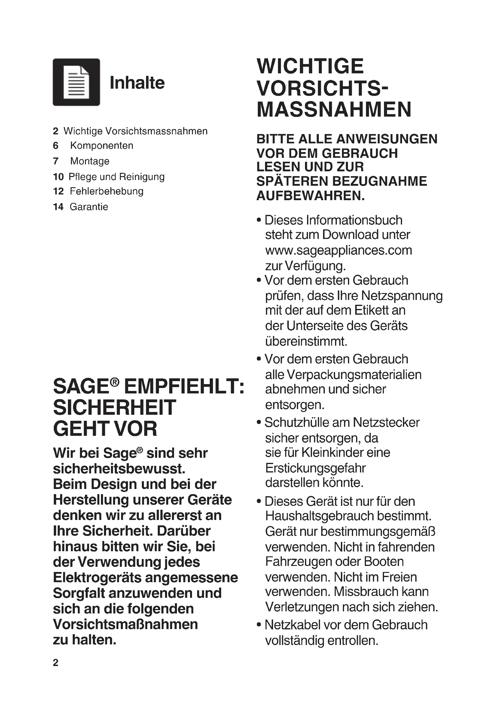 - Netzkabel vor dem Gebrauch vollständig entrollen. 2 Wichtige Vorsichtsmassnahmen6 Komponenten7 Montage10 Pege und Reinigung12 Fehlerbehebung14 Garantie Inhalte SAGE