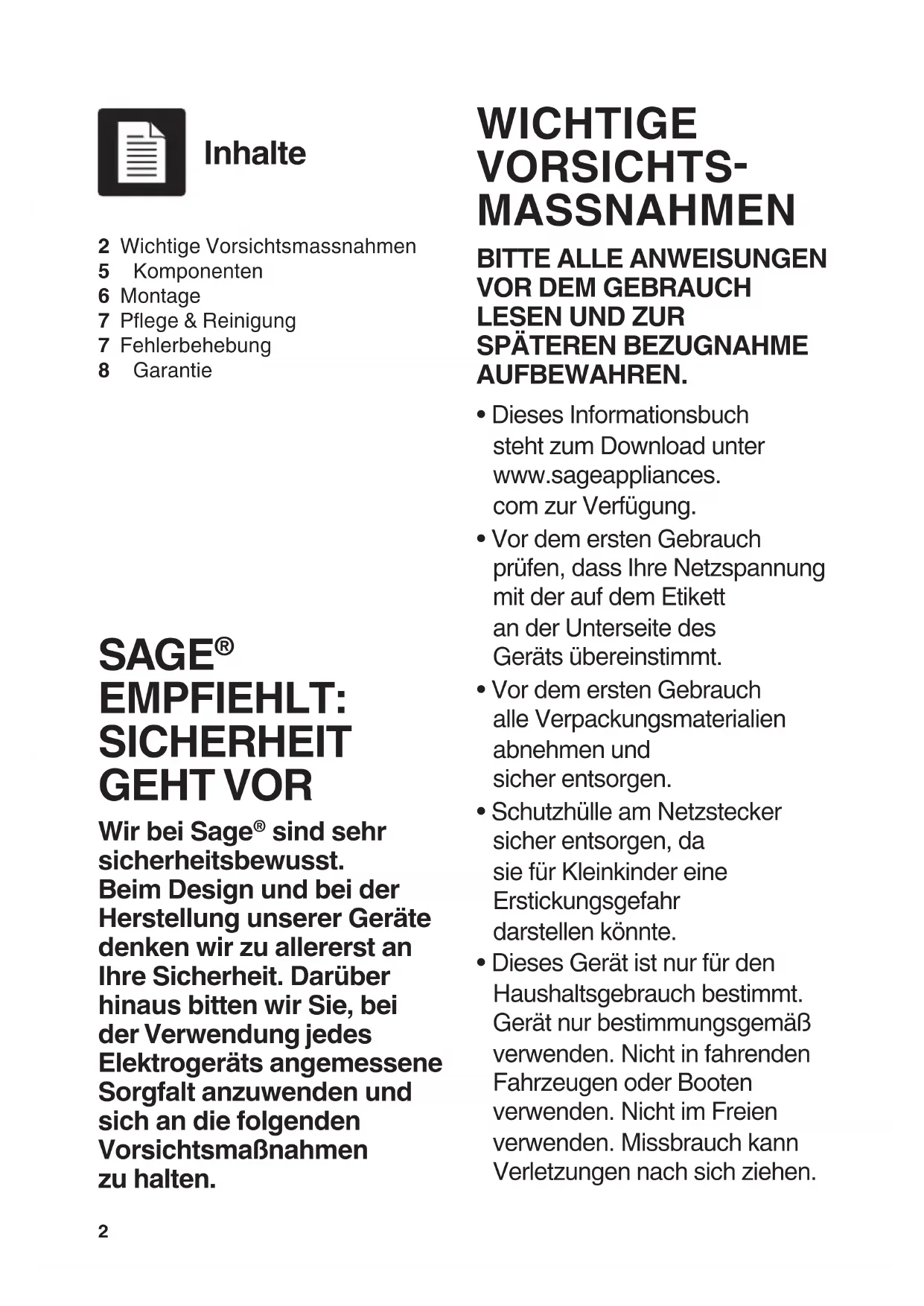 - Dieses Informationsbuch steht zum Download unter www.sageappliances. com zur Verfügung.