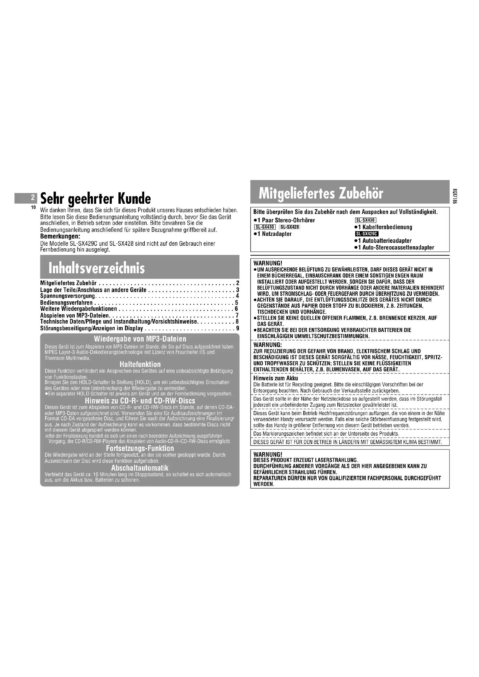 Bitte überprüfen Sie das Zubehör nach dem Auspacken auf Vollständigkeit. Inhaltsverzeichnis Sehr geehrter Kunde Wir danken Ihnen, dass Sie sich für dieses Produkt unseres Hauses entschieden haben. Bitte lesen Sie diese Bedienungsanleitung vollständig durch, bevor Sie das Gerät anschließen, in Betrieb setzen oder einstellen. Bitte bewahren Sie die Bedienungsanleitung anschließend für spätere Bezugnahme griffbereit auf. Bemerkungen: Die Modelle SL-SX429C und SL-SX428 sind nicht auf den Gebrauch einer Fernbedienung hin ausgelegt. Wiedergabe von MP3-Dateien Dieses Gerät ist zum Abspielen von MP3-Dateien im Stande, die Sie auf Discs aufgezeichnet haben. MPEG Layer-3 Audio-Dekodierungstechnologie mit Lizenz von Fraunhofer IIS und Thomson Multimedia. Haltefunktion Diese Funktion verhindert ein Ansprechen des Gerätes auf eine unbeabsichtigte Betätigung von Funktionstasten. Bringen Sie den HOLD-Schalter in Stellung [HOLD], um ein unbeabsichtigtes Einschalten des Gerätes oder eine Unterbrechung der Wiedergabe zu vermeiden. ≥Ein separater HOLD-Schalter ist jeweils am Gerät und an der Fernbedienung vorgesehen. Hinweis zu CD-R- und CD-RW-Discs Dieses Gerät ist zum Abspielen von CD-R- und CD-RW-Discs im Stande, auf denen CD-DA- oder MP3-Daten aufgezeichnet sind. Verwenden Sie eine für Audioaufzeichnungen im Format CD-DA vorgesehene Disc, und führen Sie nach der Aufzeichnung eine Finalisierung