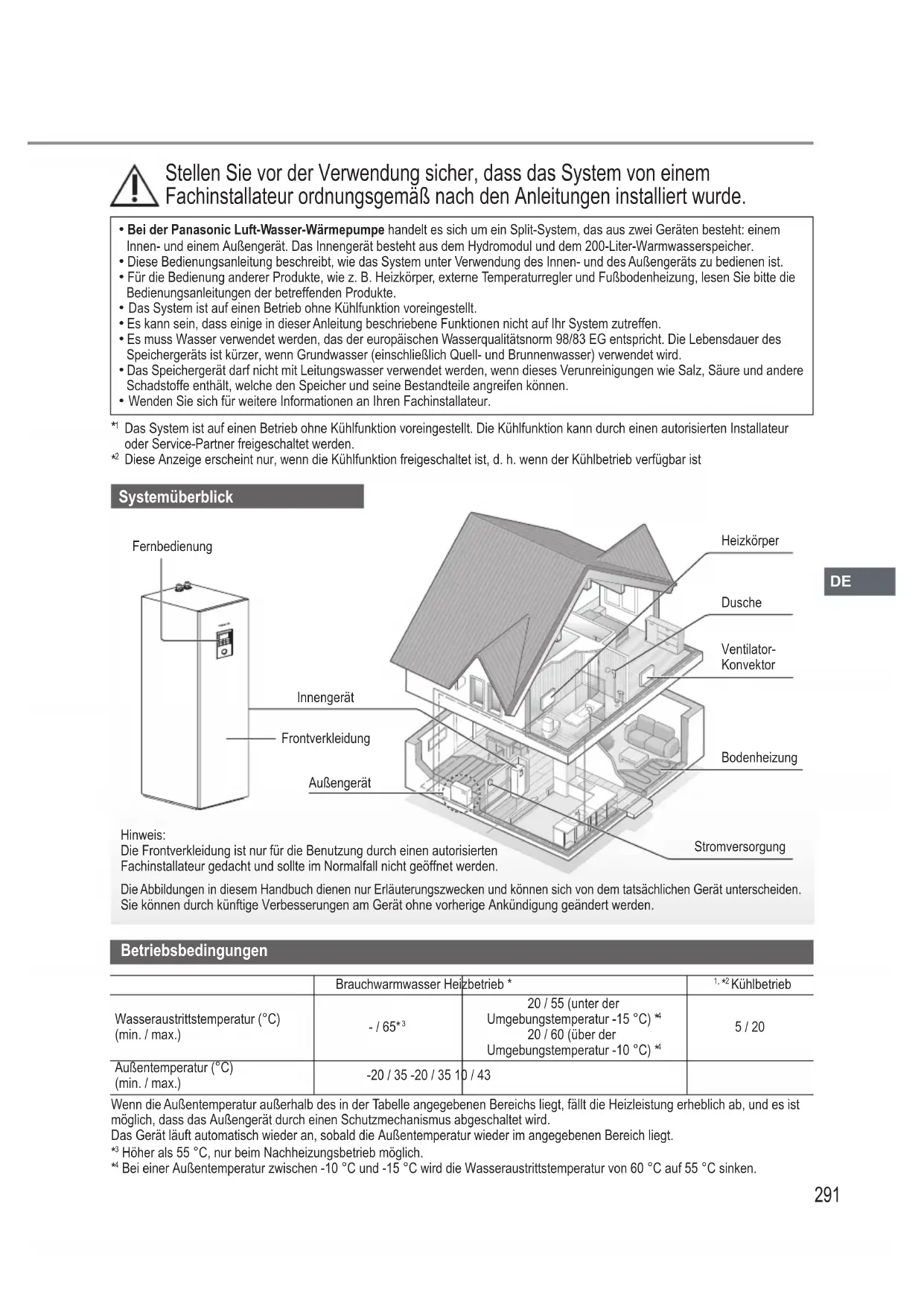 Bei einer Außentemperatur zwischen -10 °C und -15 °C wird die Wasseraustrittstemperatur von 60 °C auf 55 °C sinken Systemüberblick Heizkörper Dusche Ventilator- Konvektor Bodenheizung Außengerät Stromversorgung Die Abbildungen in diesem Handbuch dienen nur Erläuterungszwecken und können sich von dem tatsächlichen Gerät unterscheiden Sie können durch künftige Verbesserungen am Gerät ohne vorherige Ankündigung geändert werden Hinweis: Die Frontverkleidung ist nur für die Benutzung durch einen autorisierten Fachinstallateur gedacht und sollte im Normalfall nicht geöffnet werden Innengerät Fernbedienung Frontverkleidung292 Sicherheitshinweise Um Personen- oder Geräteschäden zu vermeiden, sind die nachfolgend aufgeführten Sicherheitshinweise zu beachten: Die verwendeten Warnhinweise untergliedern sich entsprechend ihrer Wichtigkeit wie folgt: Dieses Gerät ist nicht für die Verwendung durch die allgemeine Öffentlichkeit gedacht VORSICHT Die Nichtbeachtung dieses Hinweises kann zu schweren Verletzungen oder gar zum Tod führen ACHTUNG Die Nichtbeachtung dieses Hinweises kann zu Verletzungen oder zu Beschädigungen führen Bei den folgenden Symbolen handelt es sich um Verbote bzw Gebote: Dieses Symbol weist darauf hin, dass eine bestimmte Tätigkeit NICHT durchgeführt werden darf Diese Symbole weisen darauf hin, dass bestimmte Tätigkeiten durchgeführt werden MÜSSEN VORSICHT Innen- und Außengerät Dieses Gerät kann von Kindern ab 8 Jahren sowie Personen verwendet werden, welche eingeschränkte körperliche, sensorische oder geistige Fähigkeiten aufweisen bzw fehlende Erfahrung und Kenntnis im Umgang mit diesem Gerät haben, wenn sie zuerst auf sichere Weise instruiert wurden oder während der Gerätebedienung beaufsichtigt werden und die damit verbundenen Gefahren verstanden haben Kinder sollten nicht mit dem Gerät spielen Reinigung und Benutzerwartung sollten nur von Kindern durchgeführt werden, wenn diese dabei beaufsichtigt werden Bitte wenden Sie sich an einen Fachinstallateur oder Kundendienst, um die Einbauteile reinigen zu lassen bzw wenn das Gerät repariert, montiert, ausgebaut, zerlegt oder neu installiert werden soll Eine unsachgemäße Installation und Handhabung kann elektrische Schläge oder Brände verursachen oder dazu führen, dass Wasser aus dem Gerät tropft Zur Verwendung des korrekten Kältemittels wenden Sie sich an Ihren Fachhändler bzw Kundendienst Durch den Einsatz eines anderen als des angegebenen Kältemittels kann das Produkt beschädigt werden oder gar Verletzungen hervorrufen Verwenden Sie nur die vom Hersteller empfohlenen Mittel zum Beschleunigen der Entfrostung und für die Reinigung Durch den Einsatz ungeeigneter Verfahren oder die Verwendung inkompatibler Materialien können Beschädigungen des Produkts, Explosionen und ernsthafte Verletzungen hervorgerufen werden Stellen Sie das Gerät nicht in einer potenziell explosiven oder entflammbaren Atmosphäre auf Bei Nichtbeachtung kann es zu Bränden kommen293