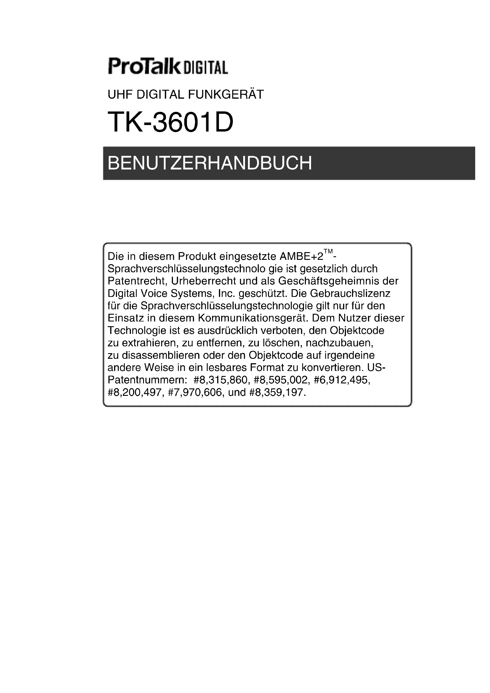 Sprachverschlüsselungstechnolo gie ist gesetzlich durch Patentrecht, Urheberrecht und als Geschäftsgeheimnis der Digital Voice Systems, Inc. geschützt. Die Gebrauchslizenz für die Sprachverschlüsselungstechnologie gilt nur für den Einsatz in diesem Kommunikationsgerät. Dem Nutzer dieser Technologie ist es ausdrücklich verboten, den Objektcode zu extrahieren, zu entfernen, zu löschen, nachzubauen, zu disassemblieren oder den Objektcode auf irgendeine andere Weise in ein lesbares Format zu konvertieren. US- Patentnummern: #8,315,860, #8,595,002, #6,912,495, #8,200,497, #7,970,606, und #8,359,197. BENUTZERHANDBUCH