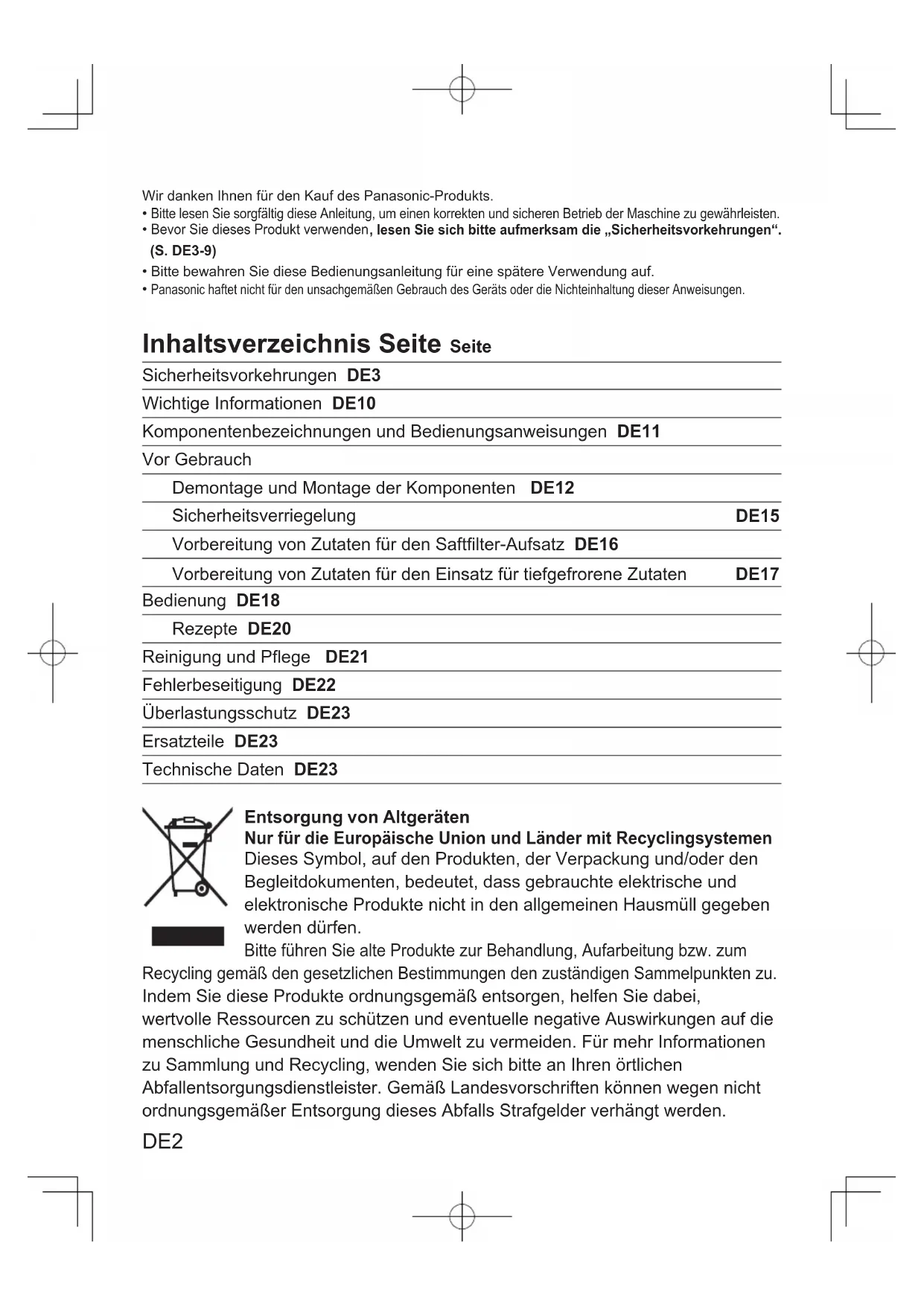 | Der Entsaffer halt plätzlich an. | Der Deckel der kleinen Einfüllöffnung ist geöffnet. → Schalten Sie den Strom ab, schreiben Sie den Deckel und beginnen Sie erneut. → Der Stromunterbrecherschutz ist aktiv. → Siehe „Überlastungsschutz". (S. DE23) Entfernen Sie unerlaubte Zutaten aus dem Entsaffer. → Verstopfung des Tresterauswurfs. → Schalten Sie den Strom ab und entfernen Sie Rückstände mit der Spitze des Handgriffs der Reinigungsbürste. |