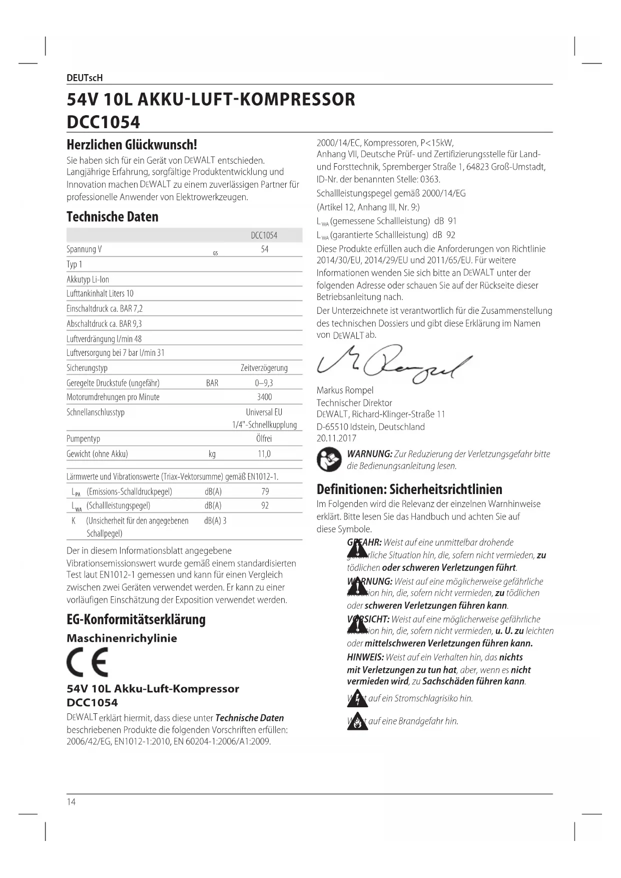 (garantierte Schallleistung) dB 92 Diese Produkte erfüllen auch die Anforderungen von Richtlinie 2014/30/EU, 2014/29/EU und 2011/65/EU. Für weitere Informationen wenden Sie sich bitte an DeWALT unter der folgenden Adresse oder schauen Sie auf der Rückseite dieser Betriebsanleitungnach. Der Unterzeichnete ist verantwortlich für die Zusammenstellung des technischen Dossiers und gibt diese Erklärung im Namen von DeWALT ab. Markus Rompel Technischer Direktor DeWALT , Richard‑Klinger‑Straße 11 D‑65510 Idstein, Deutschland