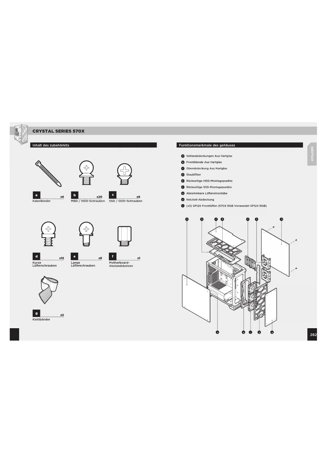 SSD / ODD-Schrauben Seitenabdeckungen Aus Hartglas Frontblende Aus Hartglas Oberabdeckung Aus Hartglas Staubfilter Rückseitige HDD-Montagepunkte Rückseitige SSD-Montagepunkte Abnehmbare Lüftereinschübe Netzteil-Abdeckung (x3) SP120 Frontlüfter (570X RGB Verwendet SP120 RGB)