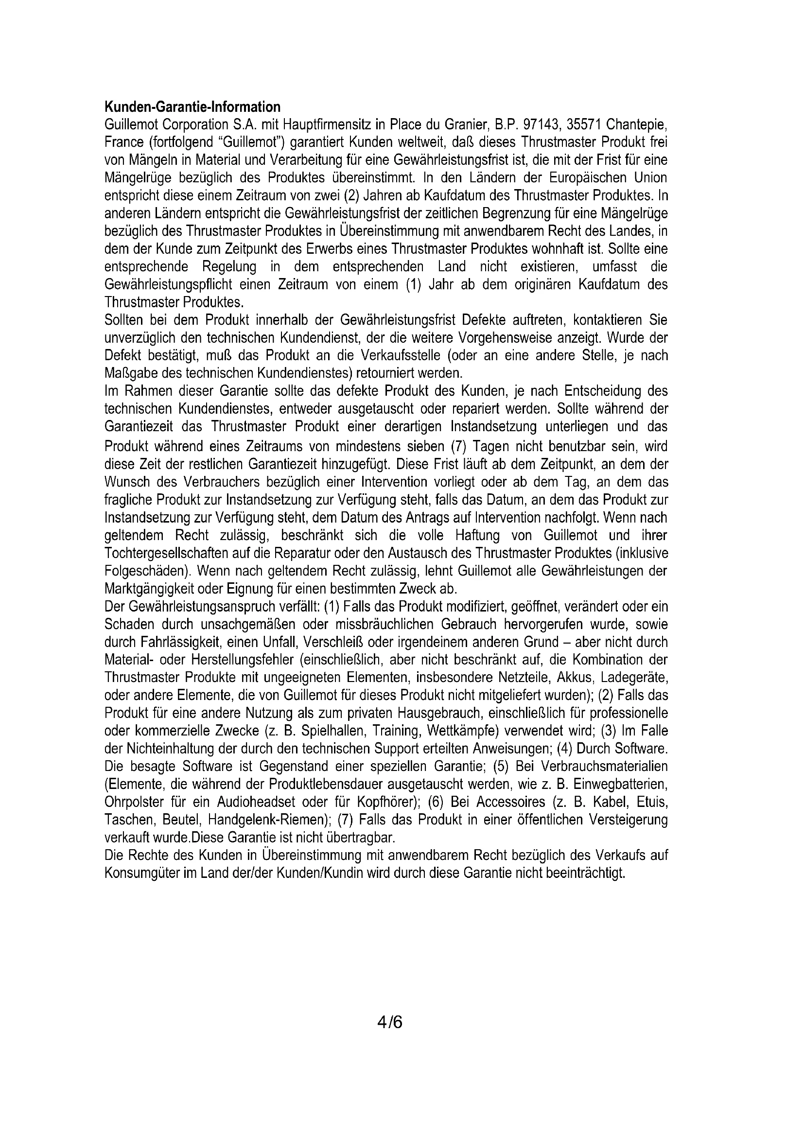 Kunden-Garantie-Information Guillemot Corporation S.A. mit Hauptfirmensitz in Place du Granier, B.P. 97143, 35571 Chantepie, France (fortfolgend “Guillemot”) garantiert Kunden weltweit, daß dieses Thrustmaster Produkt frei von Mängeln in Material und Verarbeitung für eine Gewährleistungsfrist ist, die mit der Frist für eine Mängelrüge bezüglich des Produktes übereinstimmt. In den Ländern der Europäischen Union entspricht diese einem Zeitraum von zwei (2) Jahren ab Kaufdatum des Thrustmaster Produktes. In anderen Ländern entspricht die Gewährleistungsfrist der zeitlichen Begrenzung für eine Mängelrüge bezüglich des Thrustmaster Produktes in Übereinstimmung mit anwendbarem Recht des Landes, in dem der Kunde zum Zeitpunkt des Erwerbs eines Thrustmaster Produktes wohnhaft ist. Sollte eine entsprechende Regelung in dem entsprechenden Land nicht existieren, umfasst die Gewährleistungspflicht einen Zeitraum von einem (1) Jahr ab dem originären Kaufdatum des Thrustmaster Produktes. Sollten bei dem Produkt innerhalb der Gewährleistungsfrist Defekte auftreten, kontaktieren Sie unverzüglich den technischen Kundendienst, der die weitere Vorgehensweise anzeigt. Wurde der Defekt bestätigt, muß das Produkt an die Verkaufsstelle (oder an eine andere Stelle, je nach Maßgabe des technischen Kundendienstes) retourniert werden. Im Rahmen dieser Garantie sollte das defekte Produkt des Kunden, je nach Entscheidung des technischen Kundendienstes, entweder ausgetauscht oder repariert werden. Sollte während der Garantiezeit das Thrustmaster Produkt einer derartigen Instandsetzung unterliegen und das Produkt während eines Zeitraums von mindestens sieben (7) Tagen nicht benutzbar sein, wird diese Zeit der restlichen Garantiezeit hinzugefügt. Diese Frist läuft ab dem Zeitpunkt, an dem der Wunsch des Verbrauchers bezüglich einer Intervention vorliegt oder ab dem Tag, an dem das fragliche Produkt zur Instandsetzung zur Verfügung steht, falls das Datum, an dem das Produkt zur Instandsetzung zur Verfügung steht, dem Datum des Antrags auf Intervention nachfolgt. Wenn nach geltendem Recht zulässig, beschränkt sich die volle Haftung von Guillemot und ihrer Tochtergesellschaften auf die Reparatur oder den Austausch des Thrustmaster Produktes (inklusive Folgeschäden). Wenn nach geltendem Recht zulässig, lehnt Guillemot alle Gewährleistungen der Marktgängigkeit oder Eignung für einen bestimmten Zweck ab. Der Gewährleistungsanspruch verfällt: (1) Falls das Produkt modifiziert, geöffnet, verändert oder ein Schaden durch unsachgemäßen oder missbräuchlichen Gebrauch hervorgerufen wurde, sowie durch Fahrlässigkeit, einen Unfall, Verschleiß oder irgendeinem anderen Grund – aber nicht durch Material- oder Herstellungsfehler (einschließlich, aber nicht beschränkt auf, die Kombination der Thrustmaster Produkte mit ungeeigneten Elementen, insbesondere Netzteile, Akkus, Ladegeräte, oder andere Elemente, die von Guillemot für dieses Produkt nicht mitgeliefert wurden); (2) Falls das Produkt für eine andere Nutzung als zum privaten Hausgebrauch, einschließlich für professionelle oder kommerzielle Zwecke (z. B. Spielhallen, Training, Wettkämpfe) verwendet wird; (3) Im Falle der Nichteinhaltung der durch den technischen Support erteilten Anweisungen; (4) Durch Software. Die besagte Software ist Gegenstand einer speziellen Garantie; (5) Bei Verbrauchsmaterialien (Elemente, die während der Produktlebensdauer ausgetauscht werden, wie z. B. Einwegbatterien, Ohrpolster für ein Audioheadset oder für Kopfhörer); (6) Bei Accessoires (z. B. Kabel, Etuis, Taschen, Beutel, Handgelenk-Riemen); (7) Falls das Produkt in einer öffentlichen Versteigerung verkauft wurde.Diese Garantie ist nicht übertragbar. Die Rechte des Kunden in Übereinstimmung mit anwendbarem Recht bezüglich des Verkaufs auf Konsumgüter im Land der/der Kunden/Kundin wird durch diese Garantie nicht beeinträchtigt.5