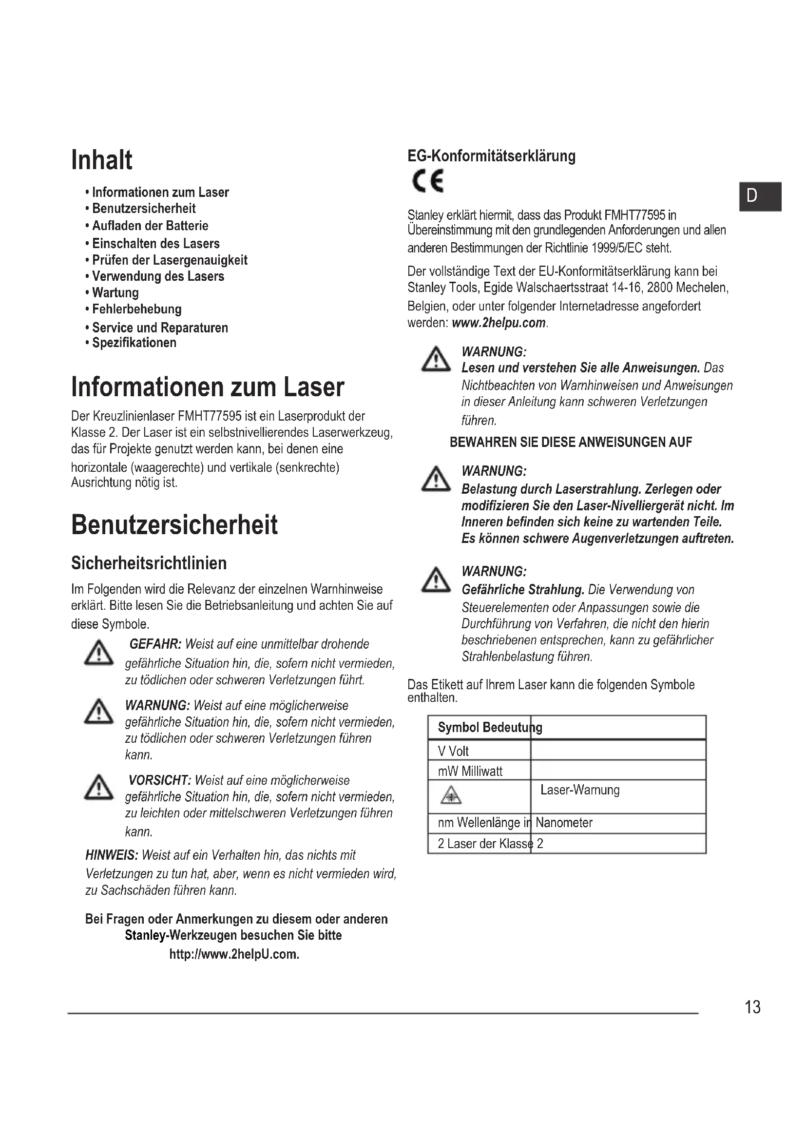 Die Werkzeugwartung MUSS durch qualifiziertes Reparaturpersonal durchgeführt werden. Service oder Wartung durch nicht qualifiziertes Personal kann zu Verletzungen führen. Ihr nachstgelegenes Stanley Service Center finden Sie auf http://www.2helpU.com. - Verwenden Sie keine optischen Werkzeuge wie Telesccope oder Tachymeter, um den Laserstrahl zu setzen. Es konnen schwere Augenverletzungen auftreten.