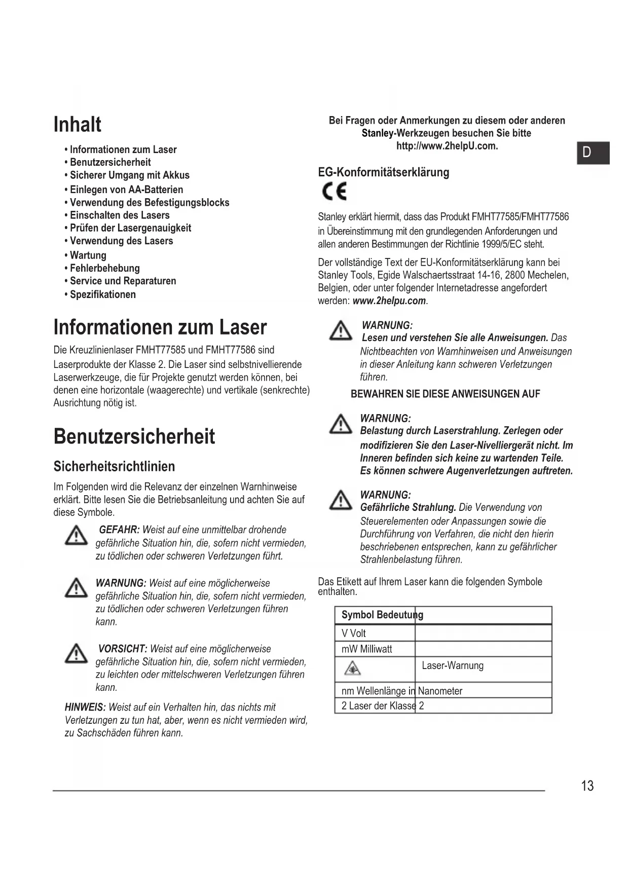 - Spezikationen Informationen zum Laser Die Kreuzlinienlaser FMHT77585 und FMHT77586 sind Laserprodukte der Klasse 2. Die Laser sind selbstnivellierende Laserwerkzeuge, die für Projekte genutzt werden können, bei denen eine horizontale (waagerechte) und vertikale (senkrechte) Ausrichtung nötig ist. Benutzersicherheit Sicherheitsrichtlinien Im Folgenden wird die Relevanz der einzelnen Warnhinweise erklärt. Bitte lesen Sie die Betriebsanleitung und achten Sie auf diese Symbole. GEFAHR: Weist auf eine unmittelbar drohende gefährliche Situation hin, die, sofern nicht vermieden, zu tödlichen oder schweren Verletzungen führt. WARNUNG: Weist auf eine möglicherweise gefährliche Situation hin, die, sofern nicht vermieden, zu tödlichen oder schweren Verletzungen führen kann. VORSICHT: Weist auf eine möglicherweise gefährliche Situation hin, die, sofern nicht vermieden, zu leichten oder mittelschweren Verletzungen führen kann. HINWEIS: Weist auf ein Verhalten hin, das nichts mit Verletzungen zu tun hat, aber, wenn es nicht vermieden wird, zu Sachschäden führen kann. Bei Fragen oder Anmerkungen zu diesem oder anderen Stanley-Werkzeugen besuchen Sie bitte http://www.2helpU.com. EG-Konformitätserklärung Stanley erklärt hiermit, dass das Produkt FMHT77585/FMHT77586 in Übereinstimmung mit den grundlegenden Anforderungen und allen anderen Bestimmungen der Richtlinie 1999/5/EC steht. Der vollständige Text der EU-Konformitätserklärung kann bei Stanley Tools, Egide Walschaertsstraat 14-16, 2800 Mechelen, Belgien, oder unter folgender Internetadresse angefordert werden: www.2helpu.com. WARNUNG: Lesen und verstehen Sie alle Anweisungen. Das Nichtbeachten von Warnhinweisen und Anweisungen in dieser Anleitung kann schweren Verletzungen führen.