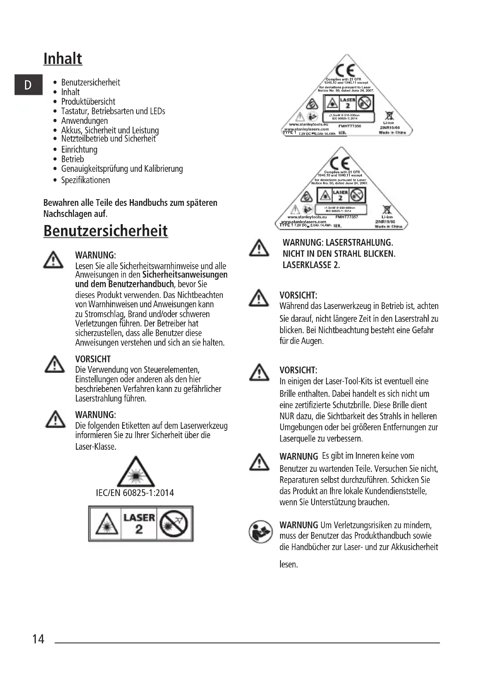 WARNUNG: LASERSTRAHLUNG. NICHT IN DEN STRAHL BLICKEN. LASERKLASSE 2. VORSICHT: Während das Laserwerkzeug in Betrieb ist, achten Sie darauf, nicht längere Zeit in den Laserstrahl zu blicken. Bei Nichtbeachtung besteht eine Gefahr für die Augen. VORSICHT: In einigen der Laser-Tool-Kits ist eventuell eine Brille enthalten. Dabei handelt es sich nicht um eine zertizierte Schutzbrille. Diese Brille dient NUR dazu, die Sichtbarkeit des Strahls in helleren Umgebungen oder bei größeren Entfernungen zur Laserquelle zu verbessern. WARNUNG Es gibt im Inneren keine vom Benutzer zu wartenden Teile. Versuchen Sie nicht, Reparaturen selbst durchzuführen. Schicken Sie das Produkt an Ihre lokale Kundendienststelle, wenn Sie Unterstützung brauchen. WARNUNG Um Verletzungsrisiken zu mindern, muss der Benutzer das Produkthandbuch sowie die Handbücher zur Laser- und zur Akkusicherheit lesen. ≤1.5mW @ 630-680nmIEC 60825-1: 2014Complies with 21 CFR1040.10 and 1040.11 exceptfor deviations pursuant to LaserNotice No. 50, dated June 24, 2007. FMHT77357 www.stanleylasers.comwww.stanleytools.euTYPE 1 7.2V DC 2.0Ah 14.4Wh 2INR19/66 Li-ionwww.stanleytools.euwww.stanleylasers.comTYPE 1 7.2V DC 2.0Ah 14.4Wh FMHT77356 ≤1.5mW @ 510-530nm IEC 60825-1: 2014 Complies with 21 CFR 1040.10 and 1040.11 except for deviations pursuant to Laser Notice No. 50, dated June 24, 2007. Li-ion 2INR19/66