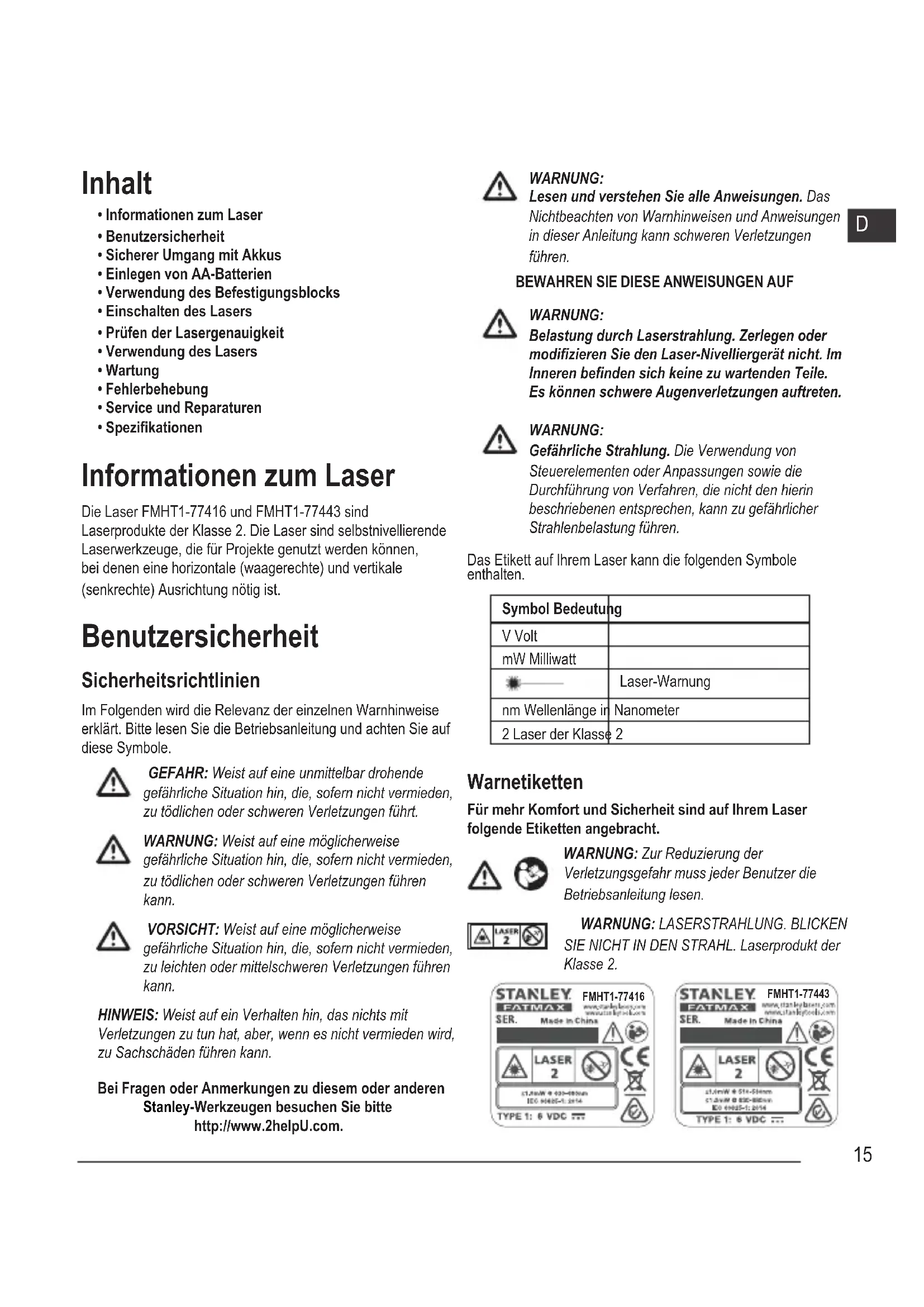 - Spezikationen Informationen zum Laser Die Laser FMHT1-77416 und FMHT1-77443 sind Laserprodukte der Klasse 2. Die Laser sind selbstnivellierende Laserwerkzeuge, die für Projekte genutzt werden können, bei denen eine horizontale (waagerechte) und vertikale (senkrechte) Ausrichtung nötig ist. Benutzersicherheit Sicherheitsrichtlinien Im Folgenden wird die Relevanz der einzelnen Warnhinweise erklärt. Bitte lesen Sie die Betriebsanleitung und achten Sie auf diese Symbole. GEFAHR: Weist auf eine unmittelbar drohende gefährliche Situation hin, die, sofern nicht vermieden, zu tödlichen oder schweren Verletzungen führt. WARNUNG: Weist auf eine möglicherweise gefährliche Situation hin, die, sofern nicht vermieden, zu tödlichen oder schweren Verletzungen führen kann. VORSICHT: Weist auf eine möglicherweise gefährliche Situation hin, die, sofern nicht vermieden, zu leichten oder mittelschweren Verletzungen führen kann. HINWEIS: Weist auf ein Verhalten hin, das nichts mit Verletzungen zu tun hat, aber, wenn es nicht vermieden wird, zu Sachschäden führen kann. Bei Fragen oder Anmerkungen zu diesem oder anderen Stanley-Werkzeugen besuchen Sie bitte http://www.2helpU.com. WARNUNG: Lesen und verstehen Sie alle Anweisungen. Das Nichtbeachten von Warnhinweisen und Anweisungen in dieser Anleitung kann schweren Verletzungen führen.