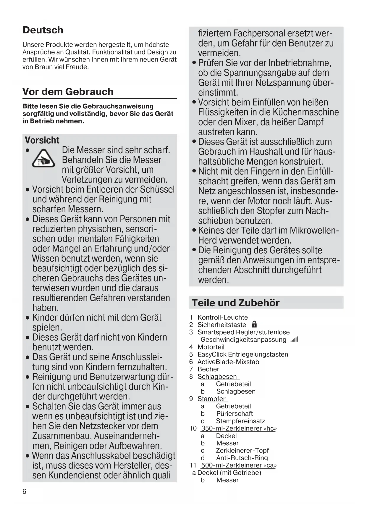 350 ml 500 ml 1250 ml 5722112414_MQ9045X_INT_S5.indd 1 29.09.16 09:386 Deutsch Unsere Produkte werden hergestellt, um höchste Ansprüche an Qualität, Funktionalität und Design zu erfüllen. Wir wünschen Ihnen mit Ihrem neuen Gerät von Braun viel Freude. Vor dem Gebrauch Bitte lesen Sie die Gebrauchsanweisung sorgfältig und vollständig, bevor Sie das Gerät in Betrieb nehmen. Vorsicht