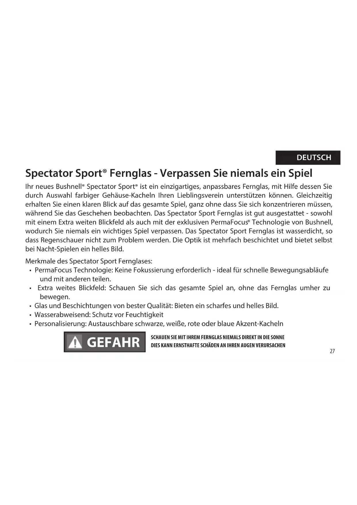 - Personalisierung: Austauschbare schwarze, weiße, rote oder blaue Akzent-Kacheln DEUTSCH SCHAUEN SIE MIT IHREM FERNGLAS NIEMALS DIREKT IN DIE SONNE DIES KANN ERNSTHAFTE SCHÄDEN AN IHREN AUGEN VERURSACHEN GEFAHR28 Augenmuschel (dreh- und arretierbar) Riemenöse Objektivlinse Okuläre Linse (Okular) Riemenöse Okuläre Linse (Okular) Augenmuschel (umklappbar)29 Vielen Dank für den Kauf Ihres neuen Bushnell® Spectator Sport® Fernglases. Diese Bedienungsanleitung hilft Ihnen bei der Optimierung Ihres Sichterlebnisses, indem sie Ihnen erläutert, wie Sie das Fernglas einstellen, verwenden und pegen. Bitte lesen Sie diese Anweisungen sorgfältig durch, bevor Sie das Fernglas benutzen. Anpassung der Augenmuschel Ihr Bushnell Spectator SportFernglas verfügt über dreh- und arretierbare Augenmuscheln (Das 8x25 Modell weist umklappbare Augenmuscheln auf.), die eine komfortable Sicht auf das komplette Bild bieten und helfen, Licht von außen fernzuhalten. Zur Verwendung ohne Brille oder Sonnenbrille, bringen Sie die Augenmuscheln nach oben, indem Sie sie im Gegenuhrzeigersinn drehen, bis sie sich in der Position ganz oben ("oben") benden (Abb. 1). Falls Sie eine Brille tragen, verwenden Sie die Augenmuscheln in der "unten"-Position - dies bringt Ihre Augen näher an die okulären Linsen des Fernglases, sodass Sie das volle Sehfeld einsehen können. Um die Augenmuscheln aus der vollen "oben"-Position zu senken, drehen Sie sie im Uhrzeigersinn (Abb. 2). Die Augenmuscheln können auch auf eine Position zwischen ganz oben und ganz unten gebracht werden, welche für manche Nutzer besser geeignet ist. IPD (Pupillendistanz / Interpupillary Distance) Anpassung Der Abstand zwischen den Pupillen der Augen, genannt Pupillendistanz, ist bei jedem Menschen unterschiedlich. Um Ihr Fernglas an Ihre IPD anzupassen: