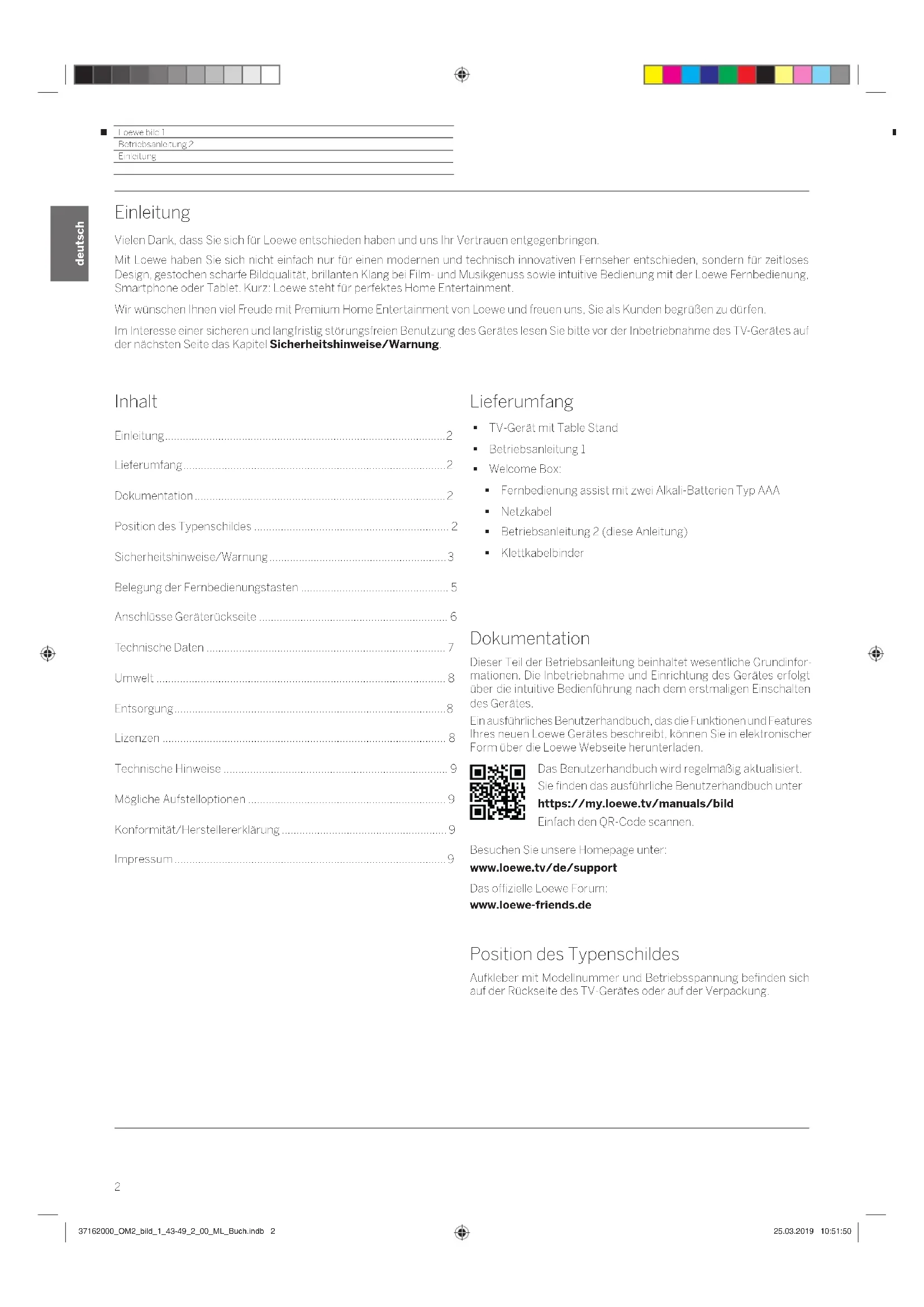 Dokumentation Dieser Teil der Betriebsanleitung beinhaltet wesentliche Grundinfor- mationen. Die Inbetriebnahme und Einrichtung des Gerätes erfolgt über die intuitive Bedienführung nach dem erstmaligen Einschalten des Gerätes. Ein ausführliches Benutzerhandbuch, das die Funktionen und Features Ihres neuen Loewe Gerätes beschreibt, können Sie in elektronischer Form über die Loewe Webseite herunterladen. Das Benutzerhandbuch wird regelmäßig aktualisiert. Sie finden das ausführliche Benutzerhandbuch unter https://my.loewe.tv/manuals/bild Einfach den QR-Code scannen. Besuchen Sie unsere Homepage unter: www.loewe.tv/de/support Das offizielle Loewe Forum: www.loewe-friends.de Position des Typenschildes Aufkleber mit Modellnummer und Betriebsspannung befinden sich auf der Rückseite des TV-Gerätes oder auf der Verpackung. Lieferumfang TV-Gerät mit Table Stand Betriebsanleitung 1 Welcome Box: Fernbedienung assist mit zwei Alkali-Batterien Typ AAA Netzkabel Betriebsanleitung 2 (diese Anleitung) Klettkabelbinder 37162000_OM2_bild_1_43-49_2_00_ML_Buch.indb 237162000_OM2_bild_1_43-49_2_00_ML_Buch.indb 2 25.03.2019 10:51:5025.03.2019 10:51:50Loewe bild 1 Betriebsanleitung 2 deutsch