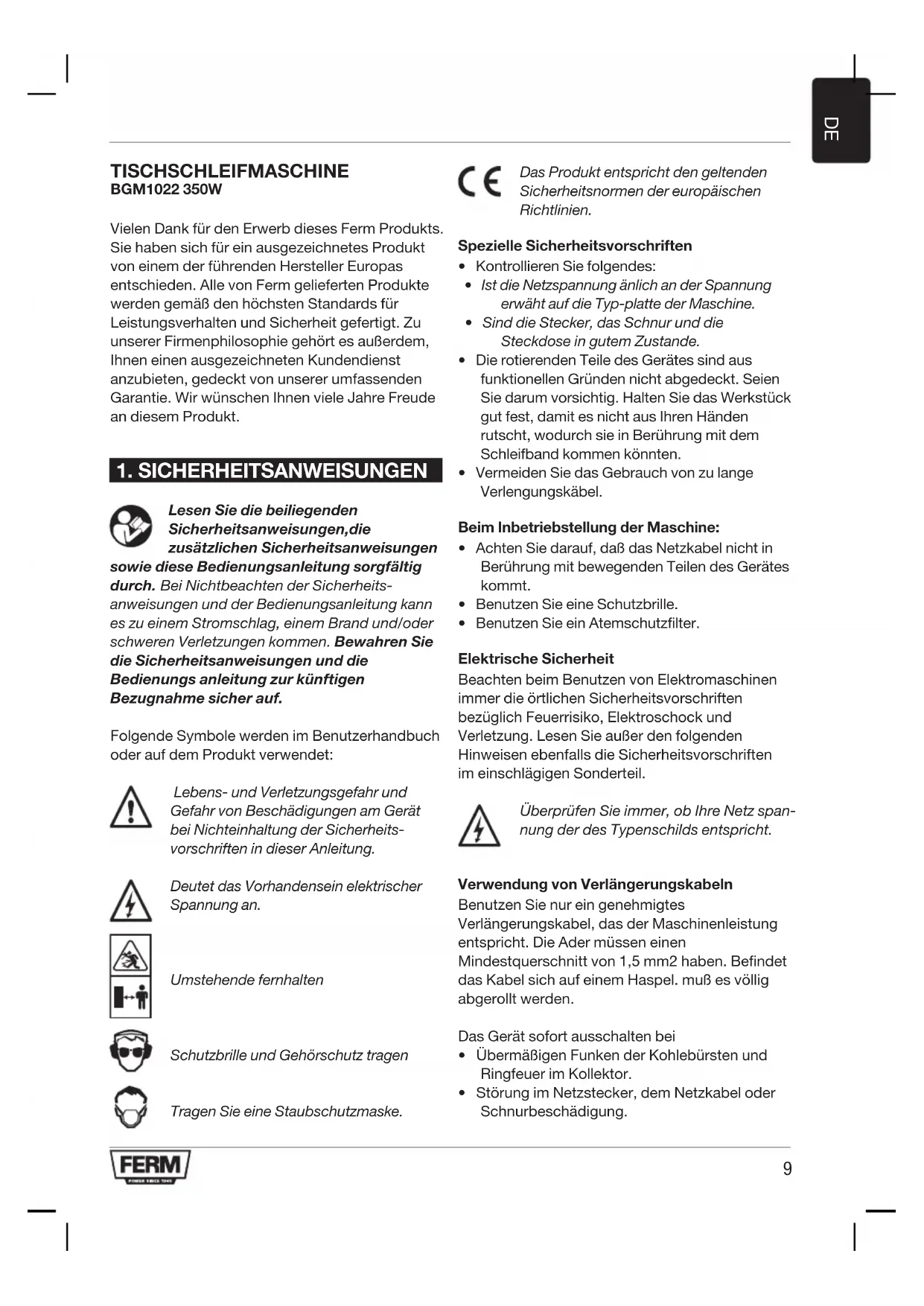 TISCHSCHLEIFMASCHINE BGM1022 350W Vielen Dank für den Erwerb dieses Ferm Produkts. Sie haben sich für ein ausgezeichnetes Produkt von einem der führenden Hersteller Europas entschieden. Alle von Ferm gelieferten Produkte werden gemäß den höchsten Standards für Leistungsverhalten und Sicherheit gefertigt. Zu unserer Firmenphilosophie gehört es außerdem, Ihnen einen ausgezeichneten Kundendienst anzubieten, gedeckt von unserer umfassenden Garantie. Wir wünschen Ihnen viele Jahre Freude an diesem Produkt.